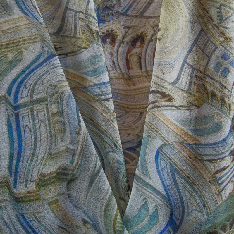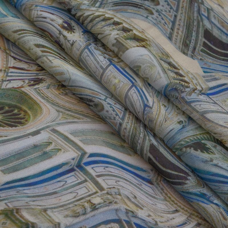 Итальянский вискозный креп-шифон с абстрактным принтом это тонкая, невероятно легкая полупрозрачная ткань полотняного переплетения с матовой поверхностью и характерной для крепа зернистой фактурой. Идеально подходит для пошива воздушных легких платьев, блуз, туник.