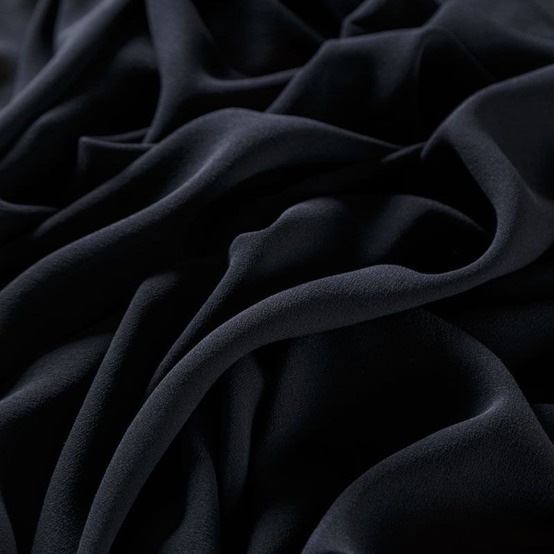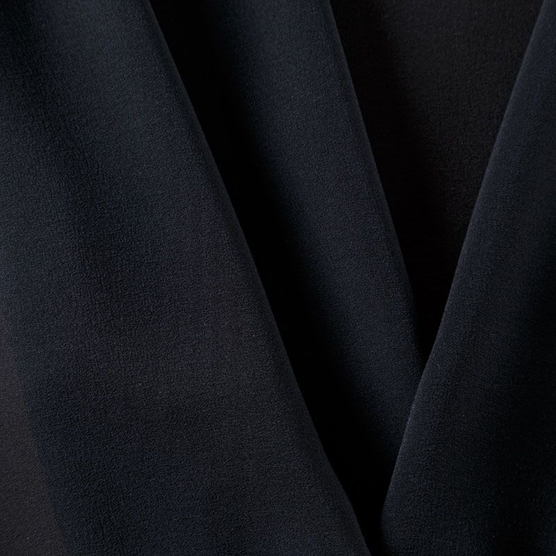 Итальянский креп-шифон черного оттенка, легкий, воздушный, мягкий и нежный, прекрасно драпируется, тянется, приятен к телу, прозрачный, требуется подклад. Текстура матовая с умеренным блеском. Идеален для нежных платьев летящих силуэтов, топов, туник, блузок, юбок с роскошными драпировками и воланами.