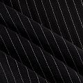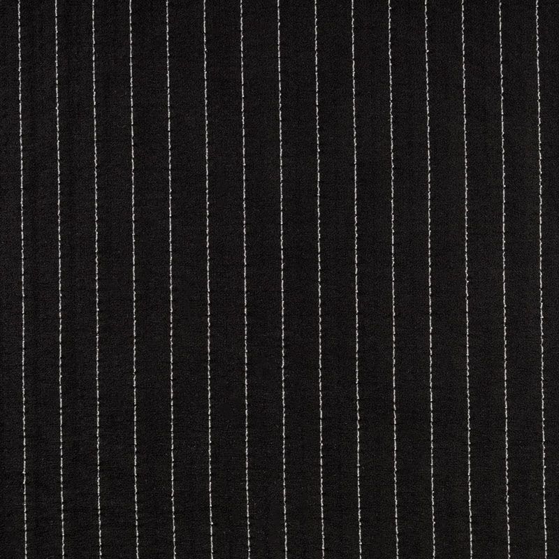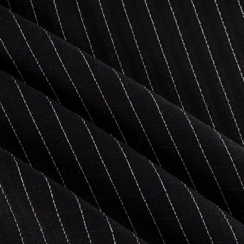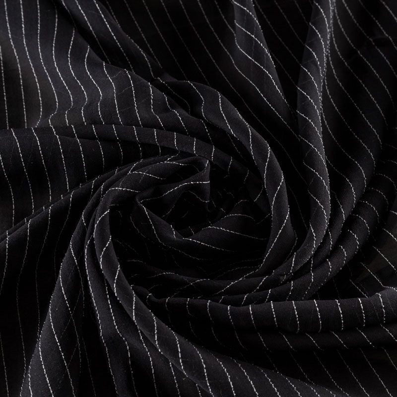 Воздушный плательно-блузочный шелк с креповой фактурой. Ткань просвечивает, тонкая, легкая, мягкая, зернистая на ощупь, пластичная, великолепно драпируется мягкими складками, ниспадает, не обладает эластичностью. При пошиве изделий может потребоваться подкладка. Идеален для платьев летящих силуэтов, топов, туник, блузок, юбок  с роскошными драпировками и воланами. На черном фоне проходит белая креповая нить, расстояние между полосками 1 см.