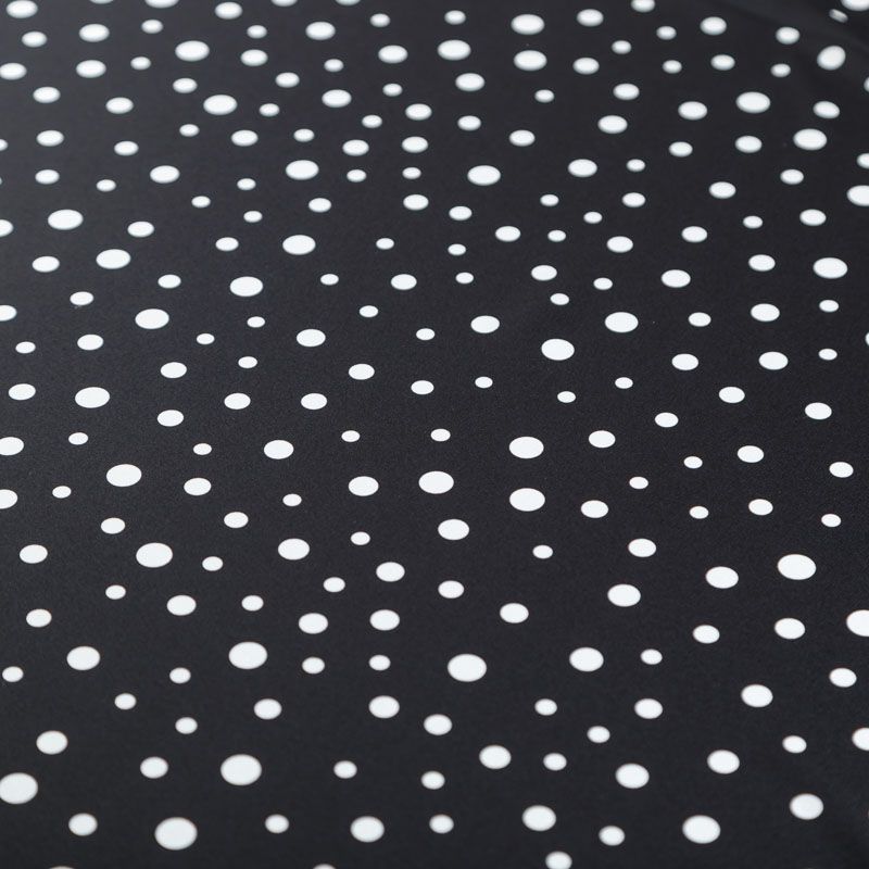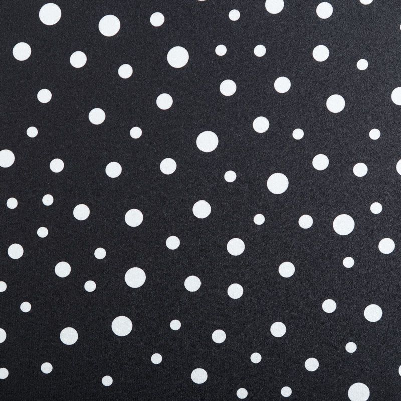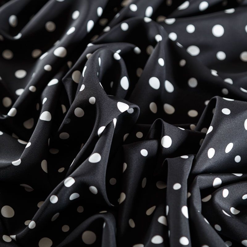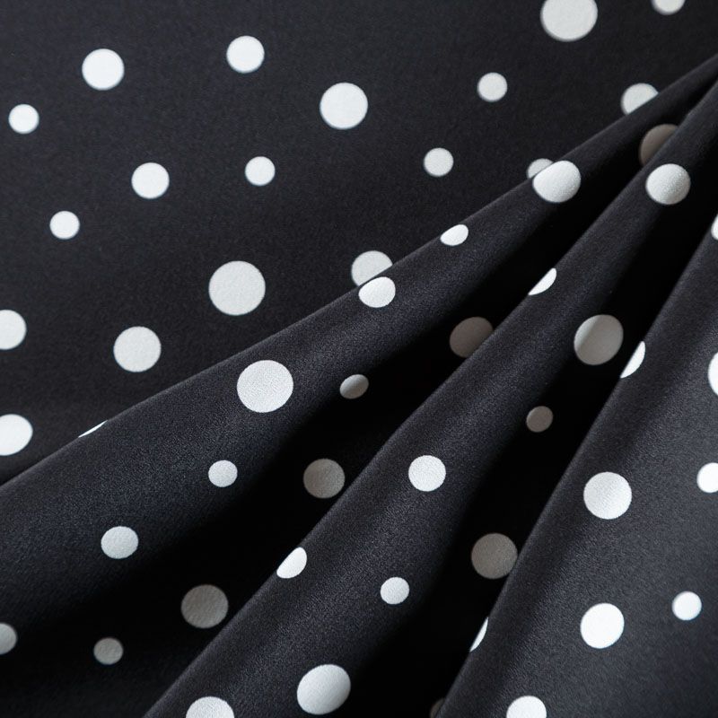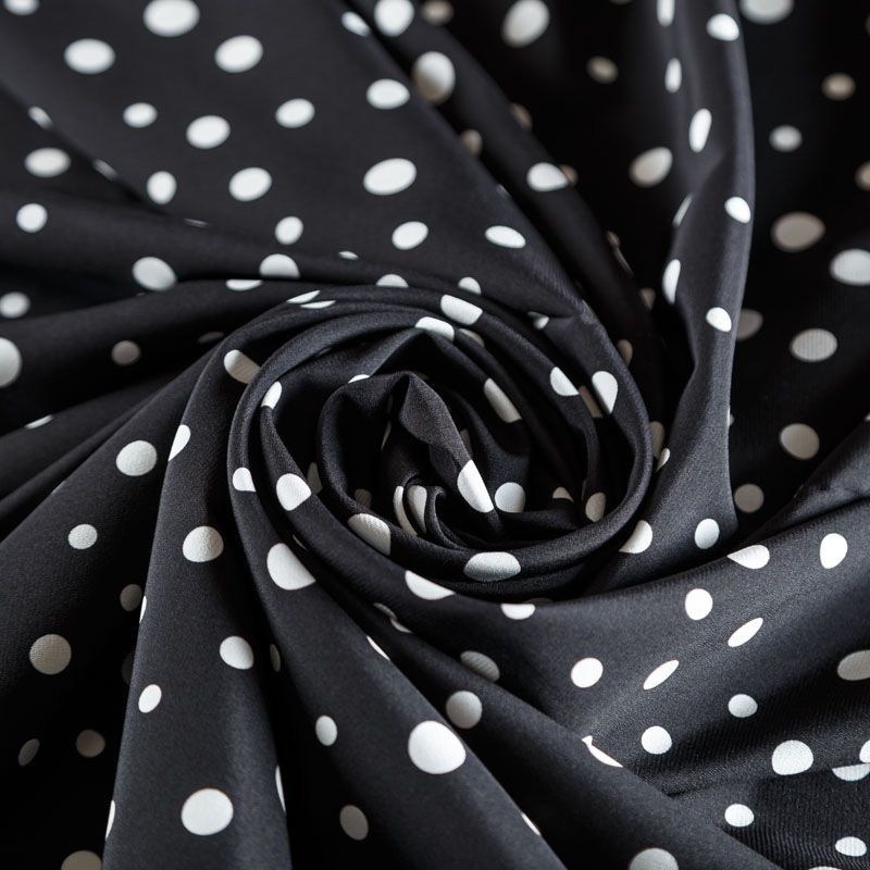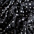 Итальянский натуральный крепдешин в черном оттенке с классическим принтом "в горошек", тонкий,  легкий и струящийся, не прозрачный, отлично драпируется, тянется за счет эластана в составе. Идеально подойдет для пошива платьев и сарафанов расклешенных моделей, с воланами, летящих юбок, топов, блузки, юбки, широких брюк, костюма в пижамном стиле.