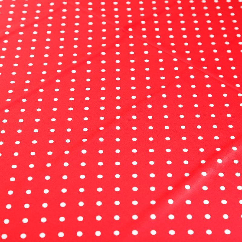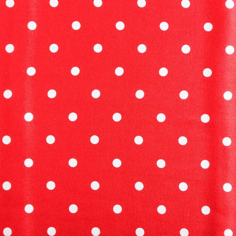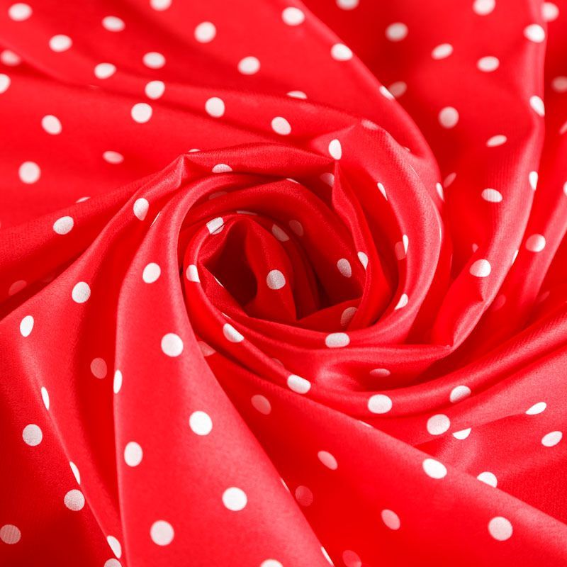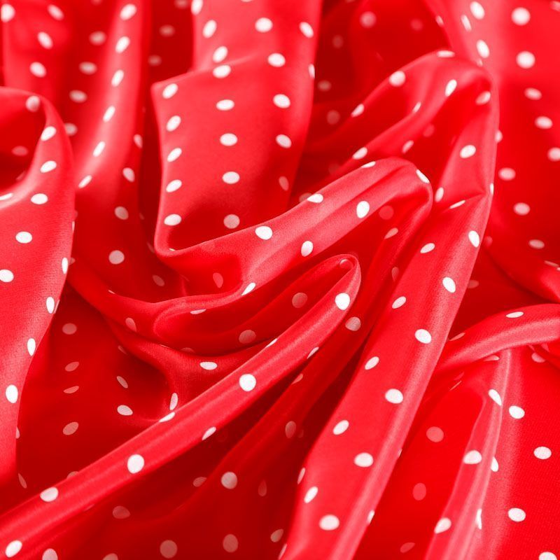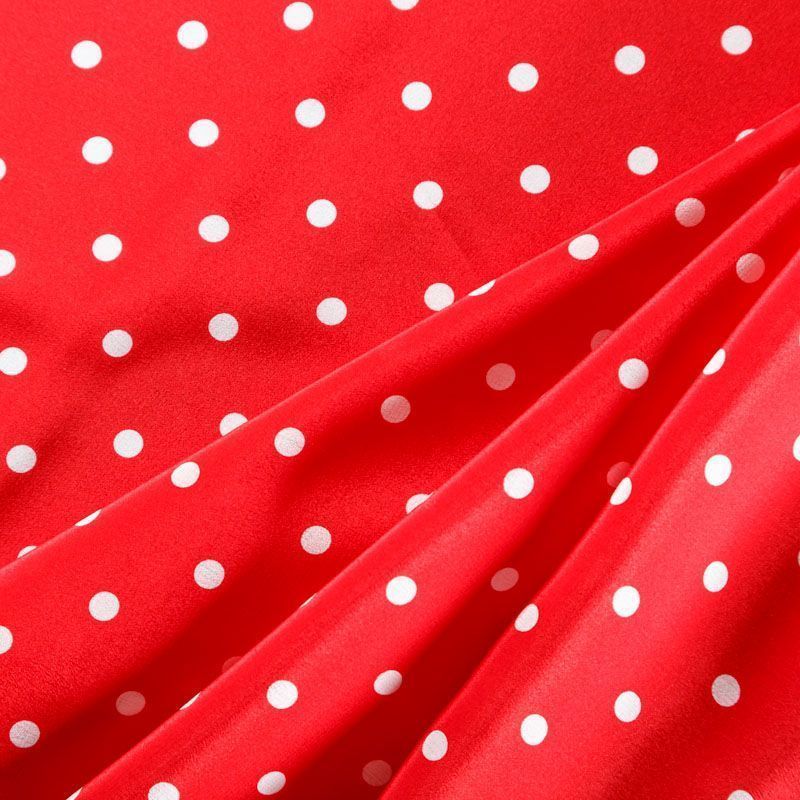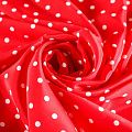 Итальянский натуральный крепдешин в сочном красном оттенке с классическим принтом "в горошек", тонкий,  легкий и струящийся, не прозрачный, отлично драпируется, тянется за счет эластана в составе. Идеально подойдет для пошива платьев и сарафанов расклешенных моделей, с воланами, летящих юбок, топов, блузки, юбки, широких брюк, костюма в пижамном стиле.