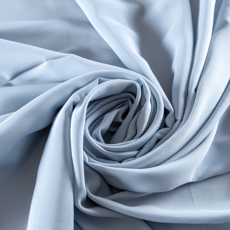 Итальянский натуральный шелковый крепдешин в светло-голубом оттенке, фактурный, легкий и струящийся, слегка просвечивает, отлично драпируется. Идеально подойдет для пошива платьев и сарафанов расклешенных моделей, с воланами, летящих юбок, топов, блузки, юбки, широких брюк, костюма в пижамном стиле.