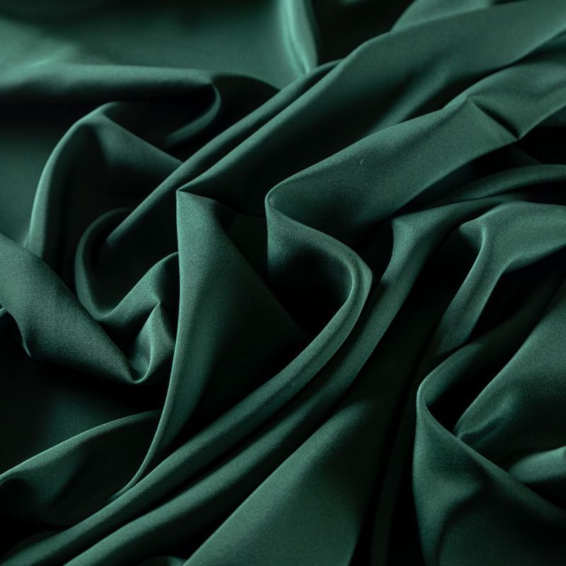 Итальянский натуральный шелковый крепдешин в темно-зеленом оттенке, слегка просвечивает, легкий и струящийся, отлично драпируется. Идеально подойдет для пошива платьев и сарафанов расклешенных моделей, с воланами, летящих юбок, топов, блузки, юбки, широких брюк, костюма в пижамном стиле.