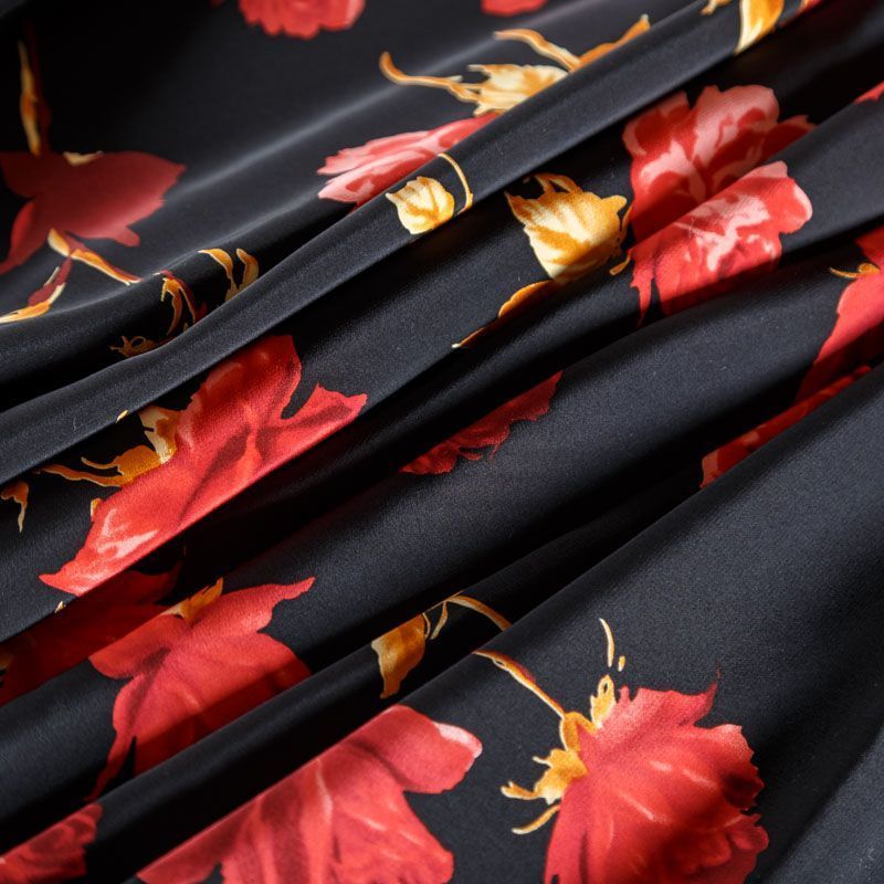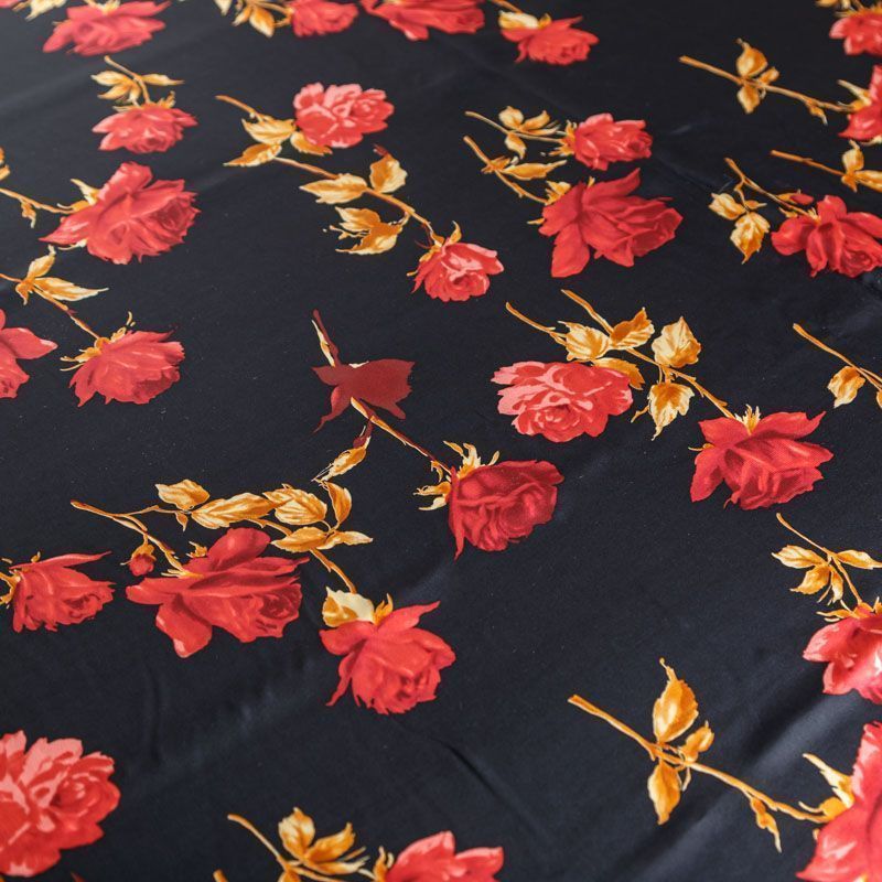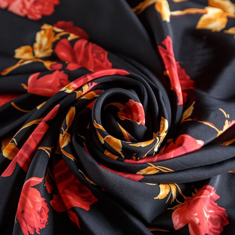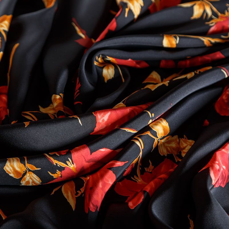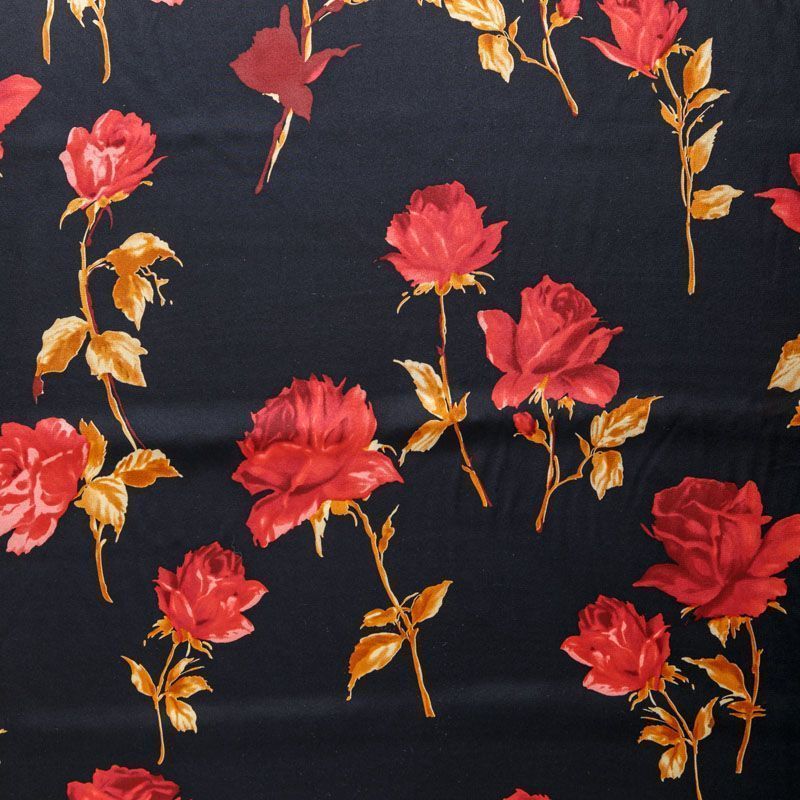 Итальянский натуральный крепдешин в черном оттенке с ярким цветочным принтом, тонкий, не прозрачный, отлично драпируется, легкий и струящийся. Идеально подойдет для пошива платьев и сарафанов расклешенных моделей, с воланами, летящих юбок, топов, блузки, юбки, широких брюк, костюма в пижамном стиле.