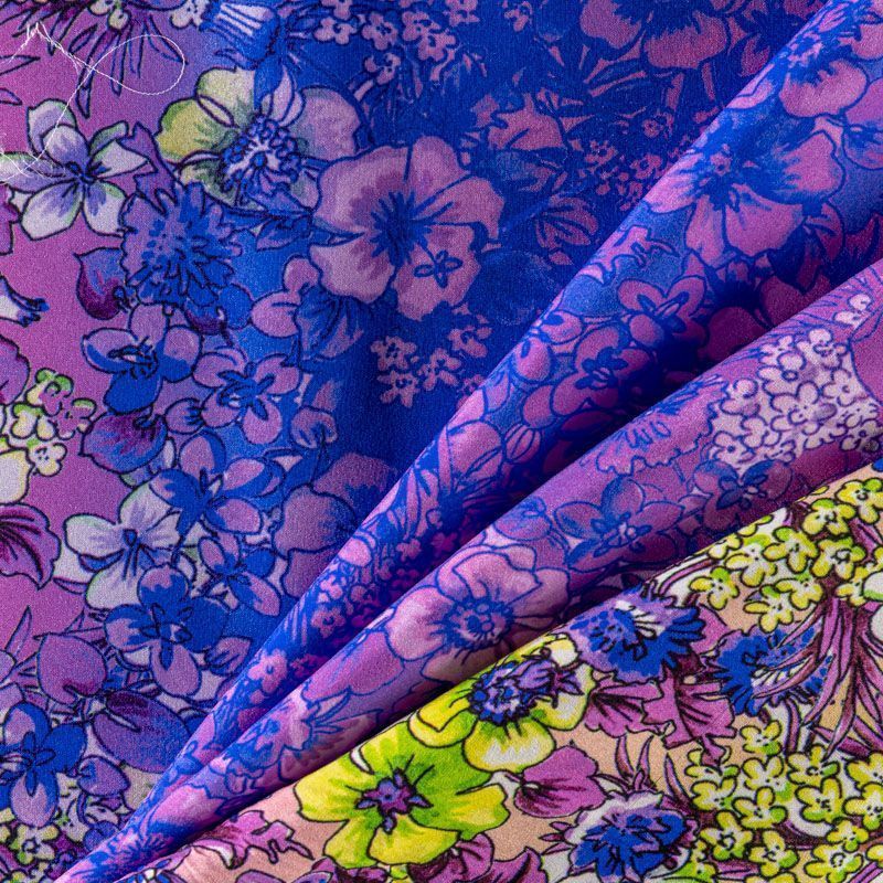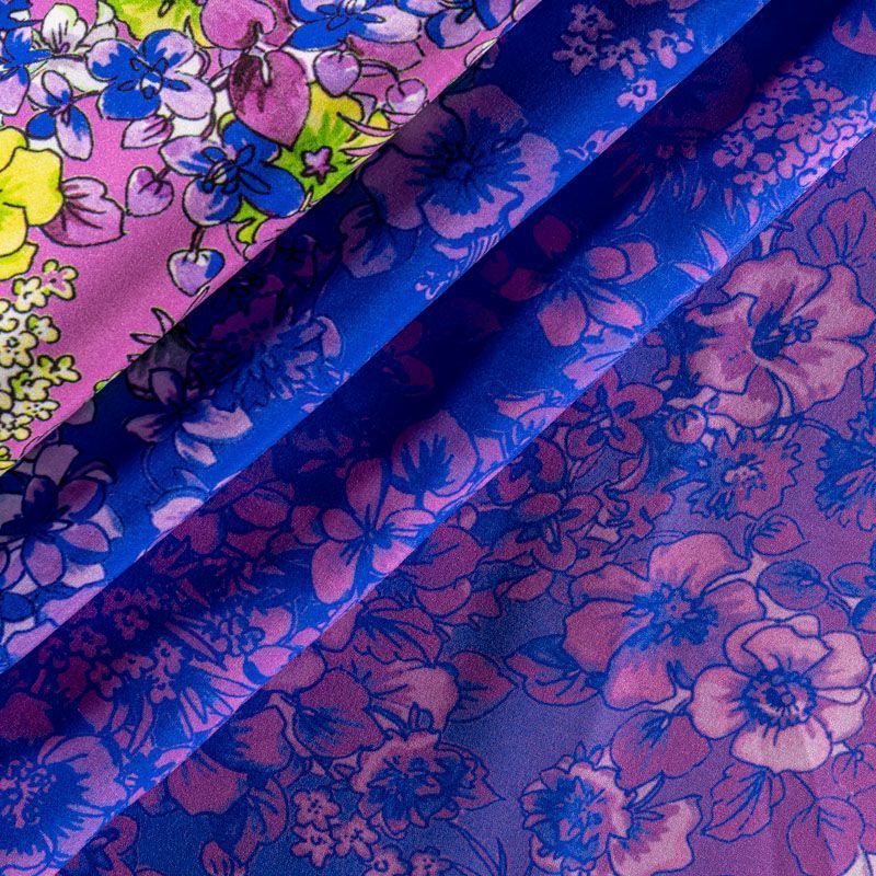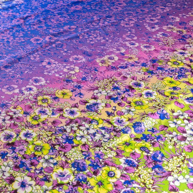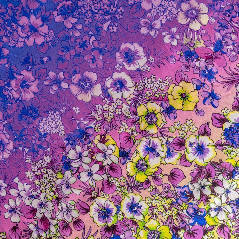 Натуральный шелковый крепдешин с эффектом деграде с плавным переходом от сиреневого до яркого-синего цвета, дополненный цветочным принтом, подойдет для ценителей ярких образов. Ткань имеет матовую поверхность, легкая, тонкая, струящаяся, хорошо драпируется, тянется за счет эластана в составе. Будет идеальна для пошива летнего сарафана, платья, блузки, костюма в пижамном стиле, широких брюк или юбки.