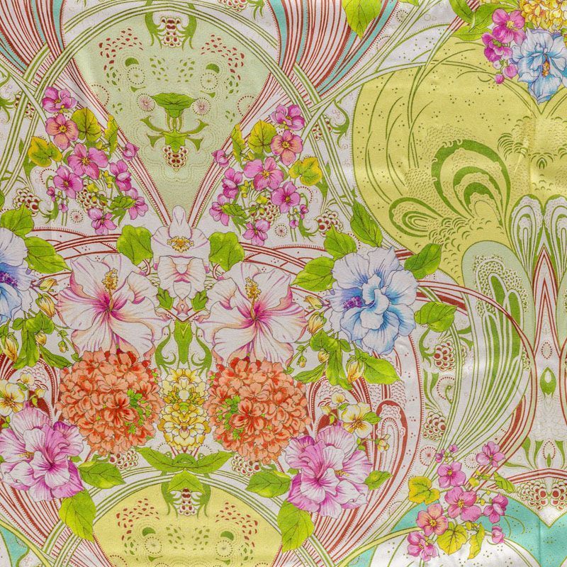 Натуральный шелковый крепдешин с матовой поверхностью, легкий, струящийся, хорошо драпируется. Цветочный принт выполнен в нежных пастельных оттенках, который будет уместен для пошива летнего сарафана, платья, блузки, костюма в пижамном стиле, широких брюк или юбки.