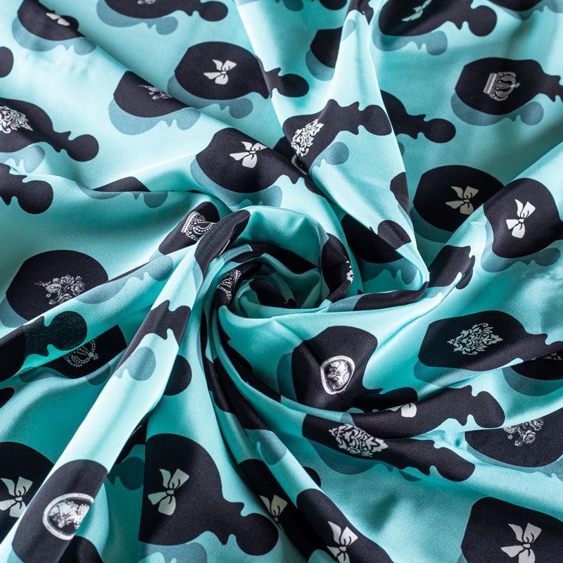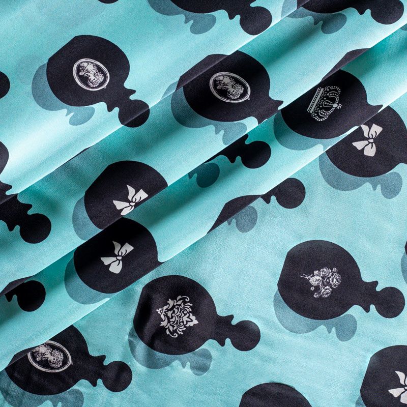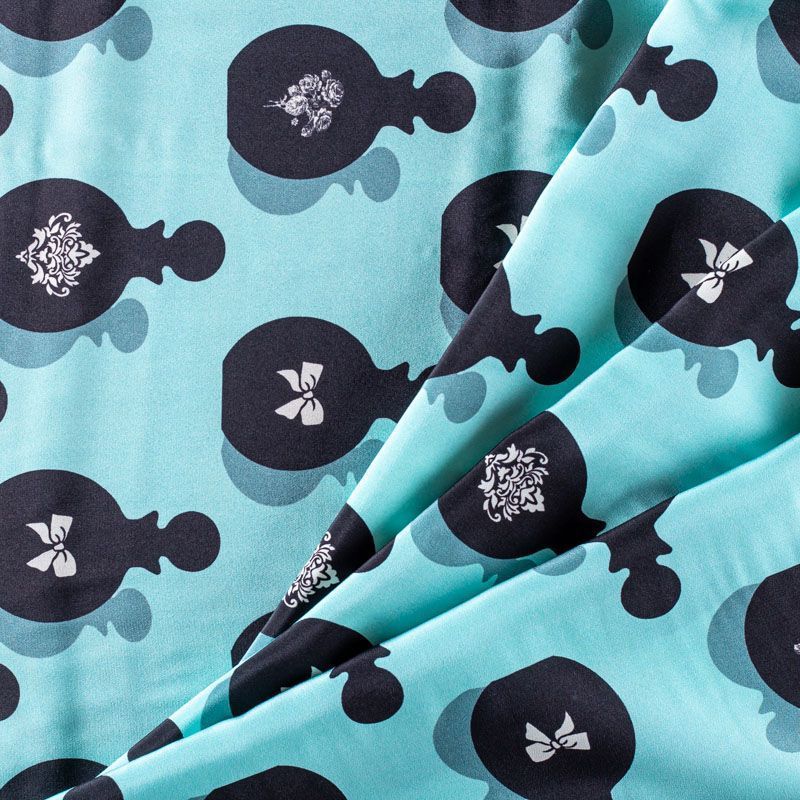 Итальянский крепдешин с матовой лицевой поверхностью со стилизованными флаконами духов на освежающем ментовом фоне, тонкий, слегка прозрачный, отлично драпируется, легкий и струящийся. Идеально подойдет для пошива платьев и сарафанов расклешенных моделей, с воланами, летящих юбок, топов, блузки, костюма в пижамном стиле.