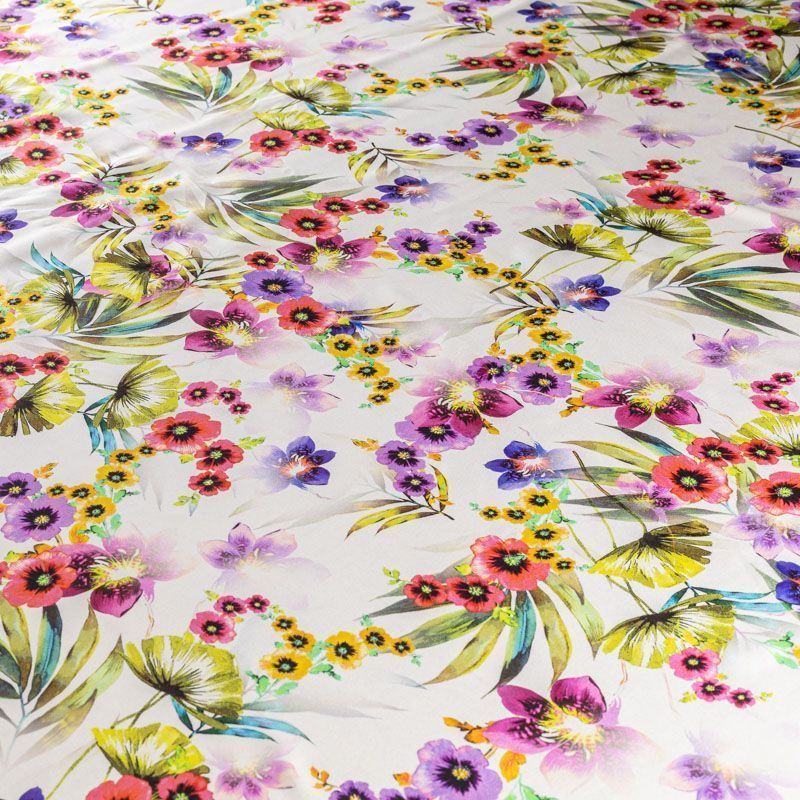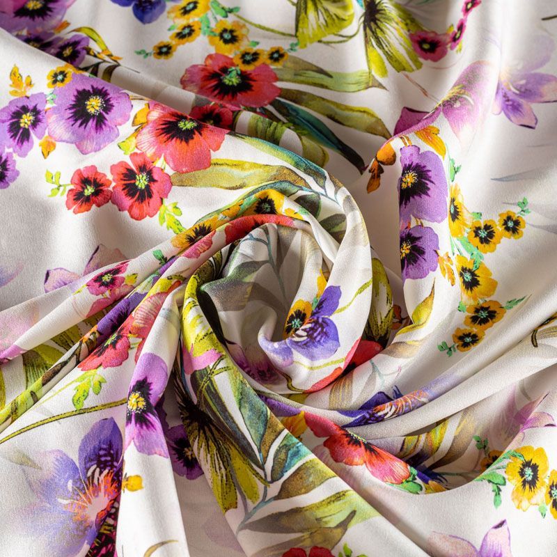 Натуральный шелковый крепдешин с матовой поверхностью, легкий, струящийся, хорошо драпируется, тянется за счет эластана в составе. Цветочный принт выполнен в ярких актуальных оттенках, который будет уместен для пошива летнего сарафана, платья, блузки, костюма в пижамном стиле, широких брюк или юбки.