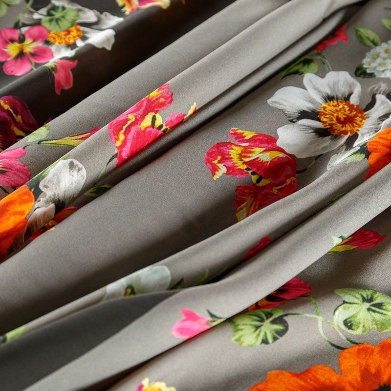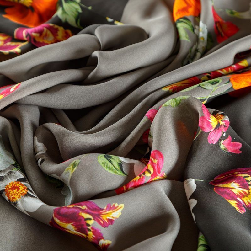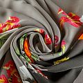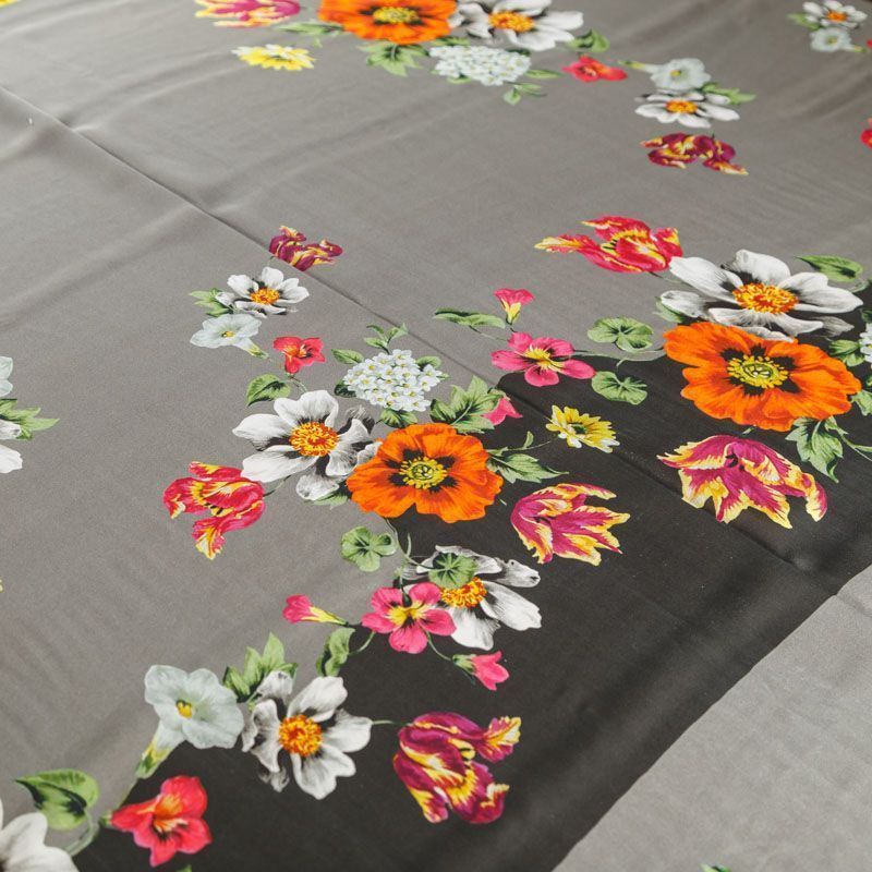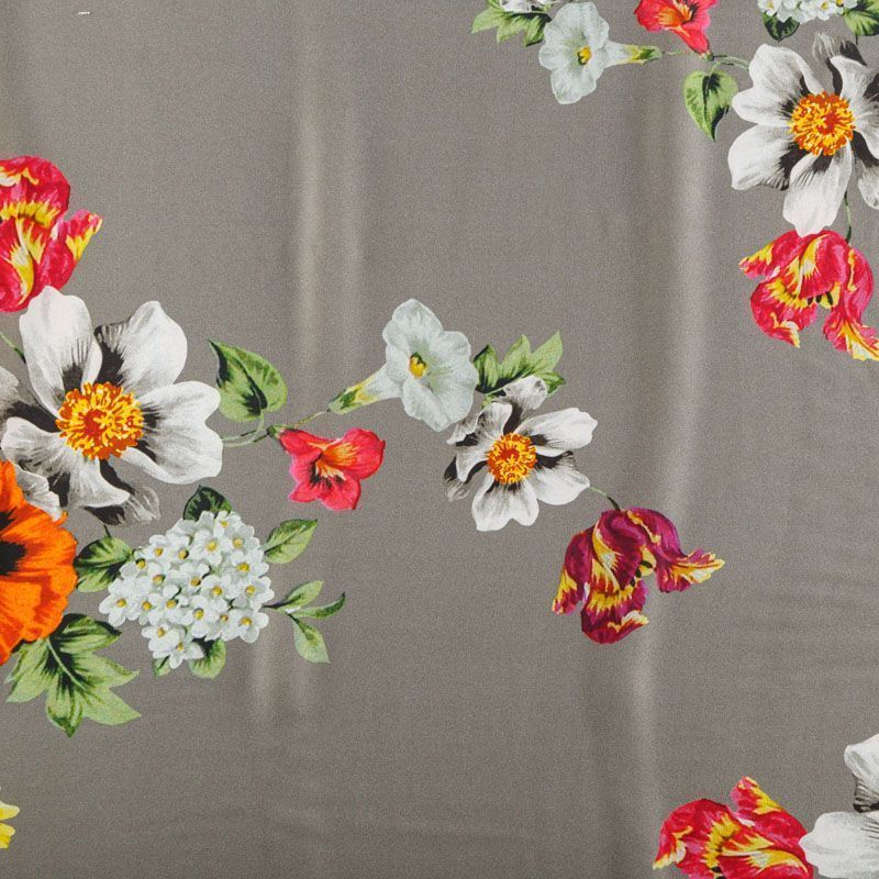 Итальянский крепдешин с матовой лицевой поверхностью ярким цветочным принтом на сером фоне, тонкий, слегка прозрачный, отлично драпируется, легкий и струящийся. Идеально подойдет для пошива платьев и сарафанов расклешенных моделей, с воланами, летящих юбок, топов, блузки, костюма в пижамном стиле.