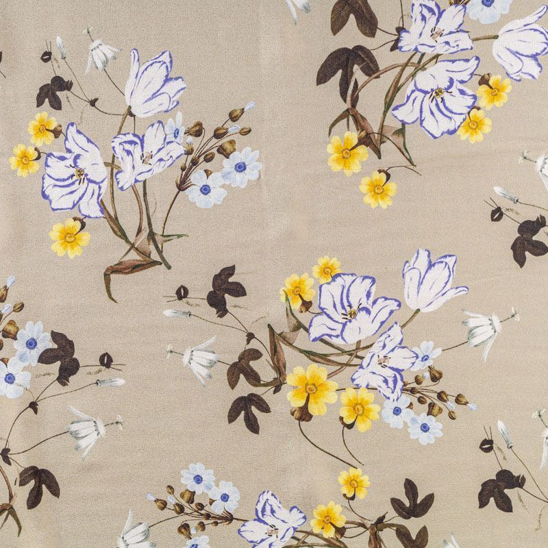 Натуральный шелковый крепдешин с матовой поверхностью, легкий, струящийся, хорошо драпируется. Нежный цветочный принт на спокойном оливковом фоне будет уместен для пошива летнего сарафана, платья, блузки, костюма в пижамном стиле, широких брюк или юбки.