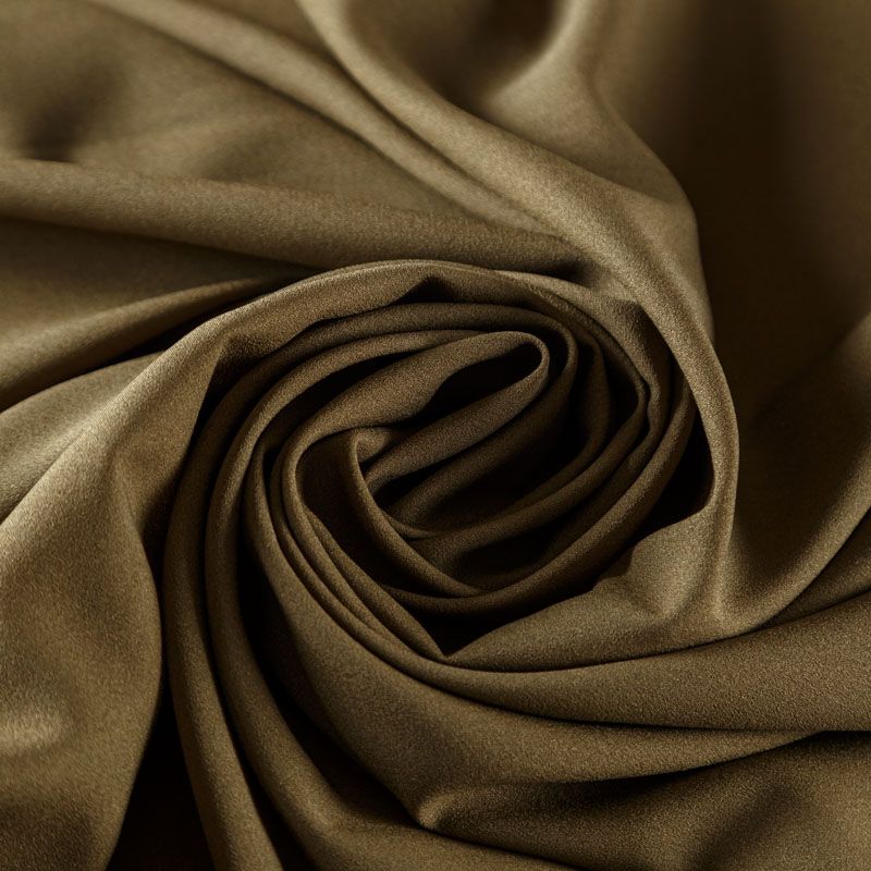 Крепдешин оттенка хаки, тонкий, легкий, фактурный, приятный на ощупь. Очень пластичный, тянется за счет эластана в составе, прекрасно драпируется и струится. Ткань слегка просвечивает, можно использовать подклад. Идеально будет смотреться в платье, юбке, тунике, рубашке или блузке.
