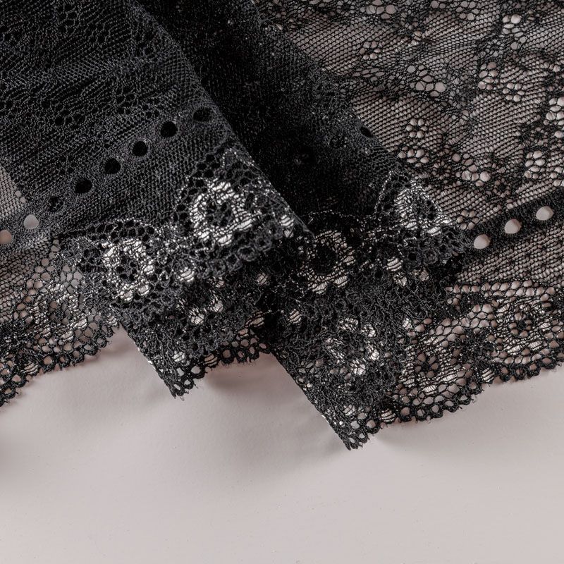 Эластичное кружево сочетает в себе мягкость, прочность и красоту, благодаря своей упругости оно долго не теряет первоначальную форму. Используется для пошива нижнего белья, а так же применяется как отделочный декор в одежде.