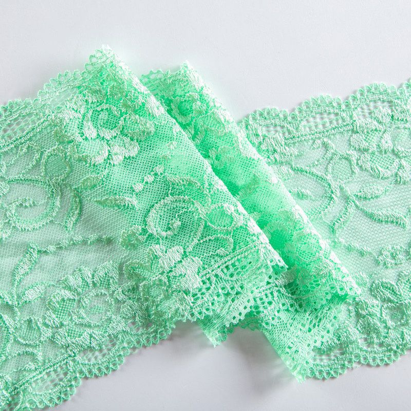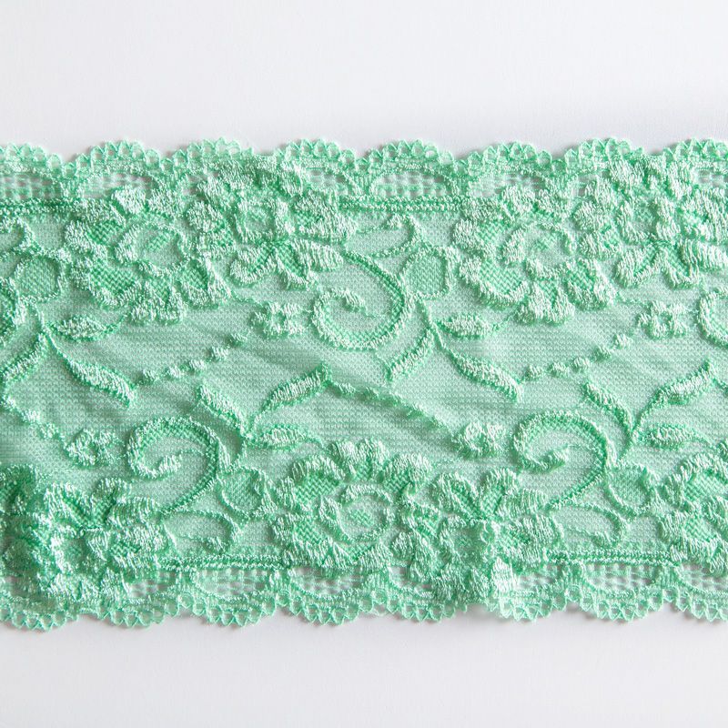 Эластичное кружево сочетает в себе мягкость, прочность и красоту, благодаря своей упругости оно долго не теряет первоначальную форму. Используется для пошива нижнего белья, а так же применяется как отделочный декор в одежде.