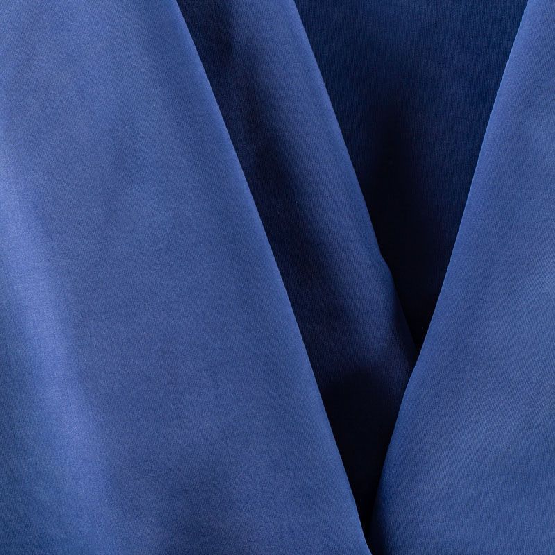 Купро плательно-костюмной плотности припыленного темно-синего оттенка. Ткань мягкая, пластичная, струящаяся, отлично драпируется, не просвечивает. Поверхность ткани бархатистая, похожа на мокрый шелк. Идеально подойдет для платьев свободного силуэта, брюк-палацио, юбок, шорт, туник, платья-рубашки, блузы.