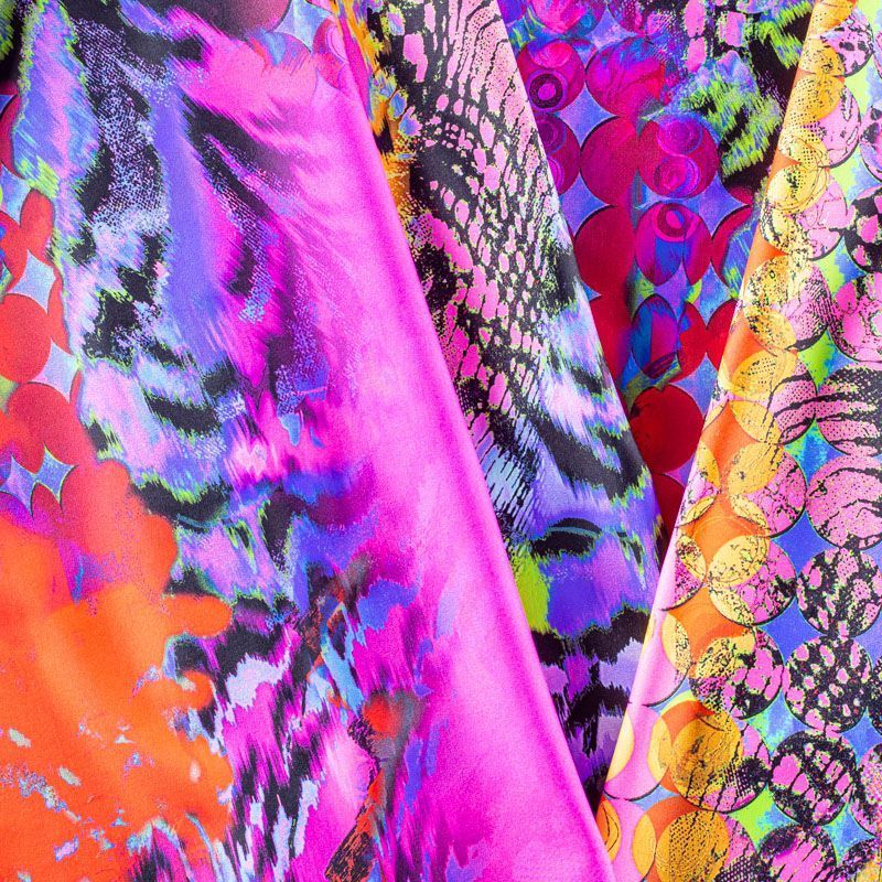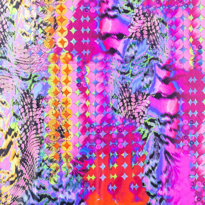 Итальянский бифлекс с насыщенным по форме, рисунку и цвету абстрактным принтом. Поверхность ткани матовая и гладкая. Отлично тянется, одежда из него не сковывает движения. Хорошо впитывает влагу и быстро высыхает, не вызывет аллергии и раздражения. Используется для пошива эстрадных, спортивных костюмов, купальников, боди.