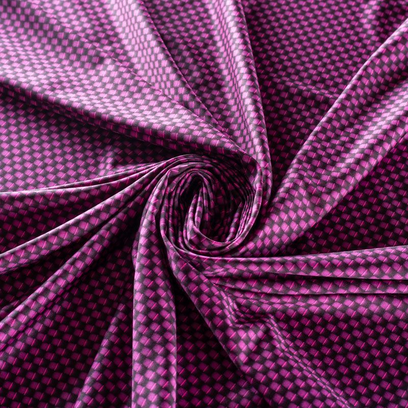 Итальянский бифлекс с мелким графическим принтом. Поверхность ткани матовая и гладкая. Отлично тянется, одежда из него не сковывает движения. Хорошо впитывает влагу и быстро высыхает, не вызывет аллергии и раздражения. Используется для пошива эстрадных, спортивных костюмов, купальников, боди.