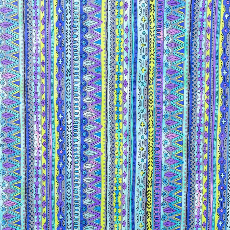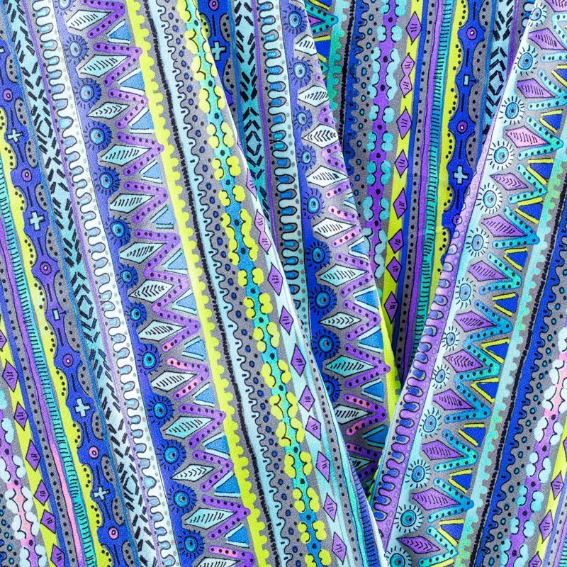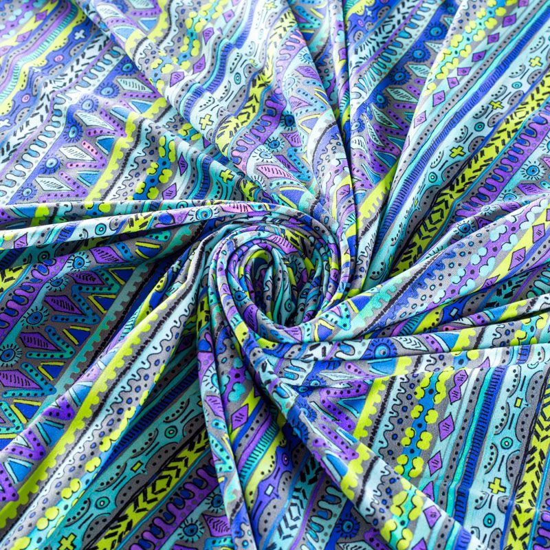 Итальянский бифлекс с цветным этническим узором. Поверхность ткани матовая и гладкая. Отлично тянется, одежда из него не сковывает движения. Хорошо впитывает влагу и быстро высыхает, не вызывет аллергии и раздражения. Используется для пошива эстрадных, спортивных костюмов, купальников, боди.