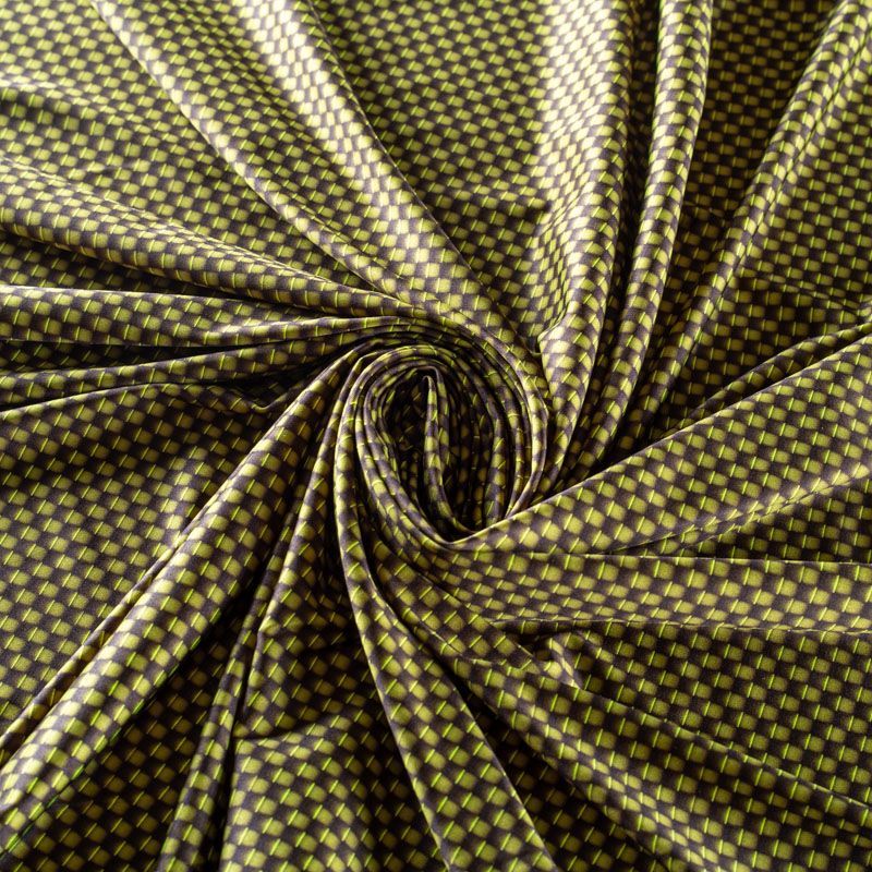 Итальянский бифлекс с мелким графическим принтом. Поверхность ткани матовая и гладкая. Отлично тянется, одежда из него не сковывает движения. Хорошо впитывает влагу и быстро высыхает, не вызывет аллергии и раздражения. Используется для пошива эстрадных, спортивных костюмов, купальников, боди.