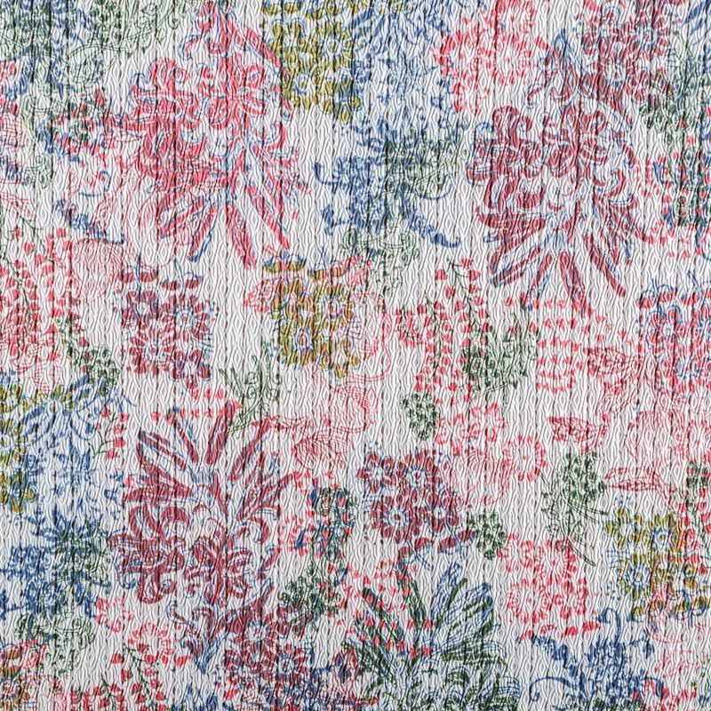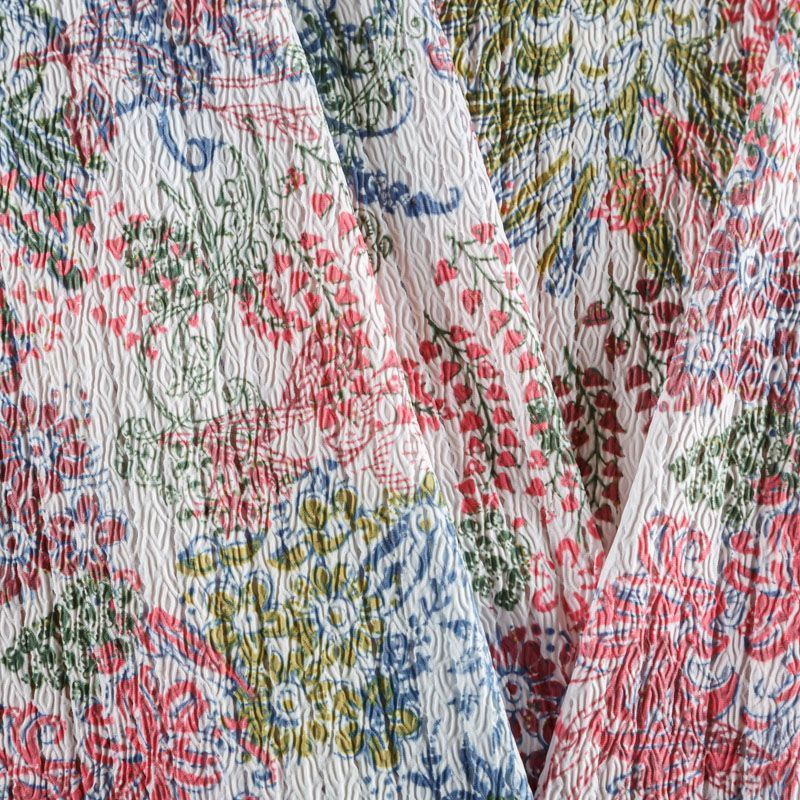 Итальяская качественная, красивая и приятная на ощупь лайкра молочного оттенка в фантазийным цветочным принтом. Поверхность ткани матовая, с жаккардовой фактурой и псевдоперфорацией.  Идеально облегает фигуру, тянется по двум направлениям, хорошо драпируется, отлично держит форму, устойчива к пилингу, долговечна и гигроскопична. Используется для пошива одежды для танцев, гимнастики, фигурного катания, для велоспорта, легкой атлетики и аэробики, фитнеса и других видов спорта, для купальников, женского белья, театральных, цирковых и эстрадных костюмов.