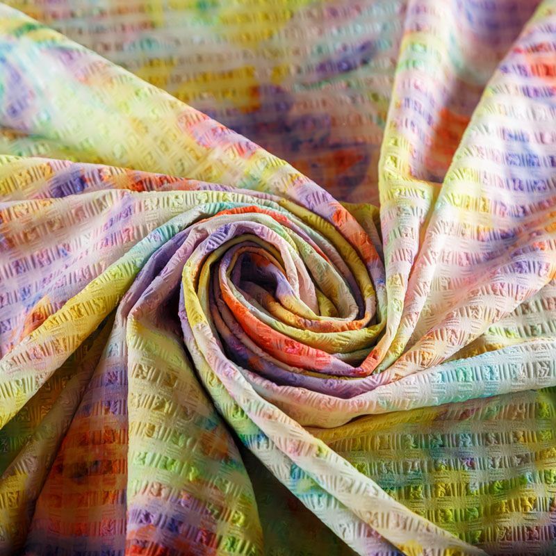 Итальяская качественная, красивая и приятная на ощупь лайкра желтого цвета в цветочным принтом в ярких оттенках. Поверхность ткани матовая, с жаккардовой фактурой и имитацией жатки.  Идеально облегает фигуру, тянется по двум направлениям, хорошо драпируется, отлично держит форму, устойчива к пилингу, долговечна и гигроскопична. Используется для пошива одежды для танцев, гимнастики, фигурного катания, для велоспорта, легкой атлетики и аэробики, фитнеса и других видов спорта, для купальников, женского белья, театральных, цирковых и эстрадных костюмов.