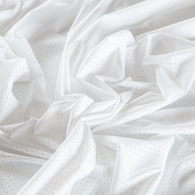 Итальяская качественная, красивая и приятная на ощупь лайкра с перфорацией молочного оттенка. Поверхность ткани матовая, гладкая, шелковистая на ощупь. Идеально облегает фигуру, тянется по двум направлениям, хорошо драпируется, отлично держит форму, устойчива к пилингу, долговечна и гигроскопична. Используется для пошива одежды для танцев, гимнастики, фигурного катания, для велоспорта, легкой атлетики и аэробики, фитнеса и других видов спорта, для купальников, женского белья, театральных, цирковых и эстрадных костюмов.