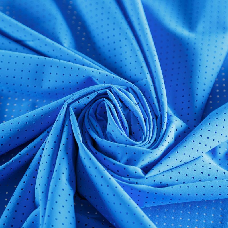 Итальяская качественная, красивая и приятная на ощупь лайкра с перфорацией синего оттенка. Поверхность ткани матовая, гладкая, шелковистая на ощупь. Идеально облегает фигуру, тянется по двум направлениям, хорошо драпируется, отлично держит форму, устойчива к пилингу, долговечна и гигроскопична. Используется для пошива одежды для танцев, гимнастики, фигурного катания, для велоспорта, легкой атлетики и аэробики, фитнеса и других видов спорта, для купальников, женского белья, театральных, цирковых и эстрадных костюмов.