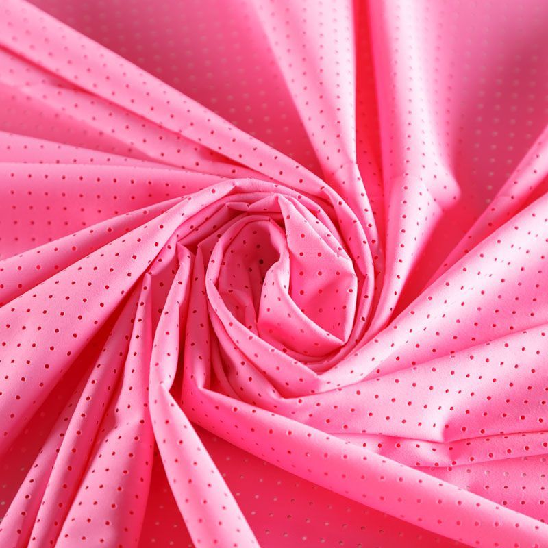 Итальяская качественная, красивая и приятная на ощупь лайкра с перфорацией ярко-розового оттенка. Поверхность ткани матовая, гладкая, шелковистая на ощупь. Идеально облегает фигуру, тянется по двум направлениям, хорошо драпируется, отлично держит форму, устойчива к пилингу, долговечна и гигроскопична. Используется для пошива одежды для танцев, гимнастики, фигурного катания, для велоспорта, легкой атлетики и аэробики, фитнеса и других видов спорта, для купальников, женского белья, театральных, цирковых и эстрадных костюмов.