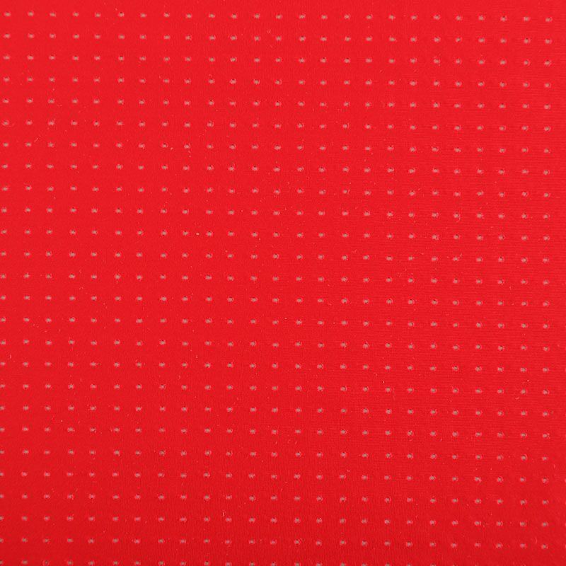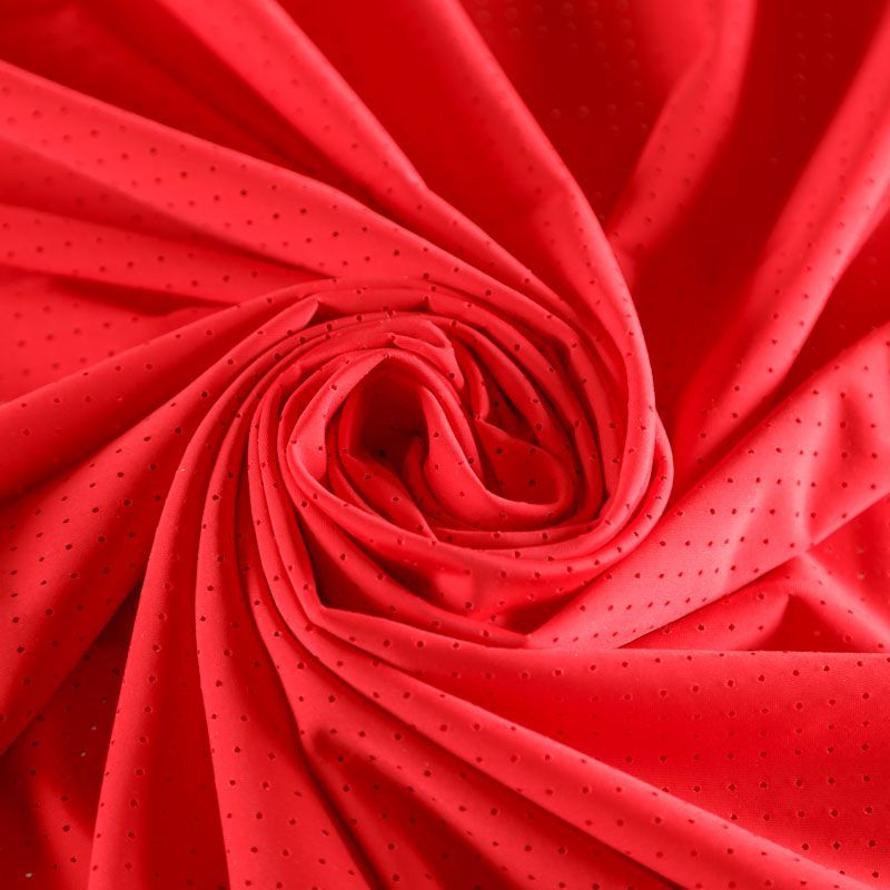 Итальяская качественная, красивая и приятная на ощупь лайкра с перфорацией красного оттенка. Поверхность ткани матовая, гладкая, шелковистая на ощупь. Идеально облегает фигуру, тянется по двум направлениям, хорошо драпируется, отлично держит форму, устойчива к пилингу, долговечна и гигроскопична. Используется для пошива одежды для танцев, гимнастики, фигурного катания, для велоспорта, легкой атлетики и аэробики, фитнеса и других видов спорта, для купальников, женского белья, театральных, цирковых и эстрадных костюмов.