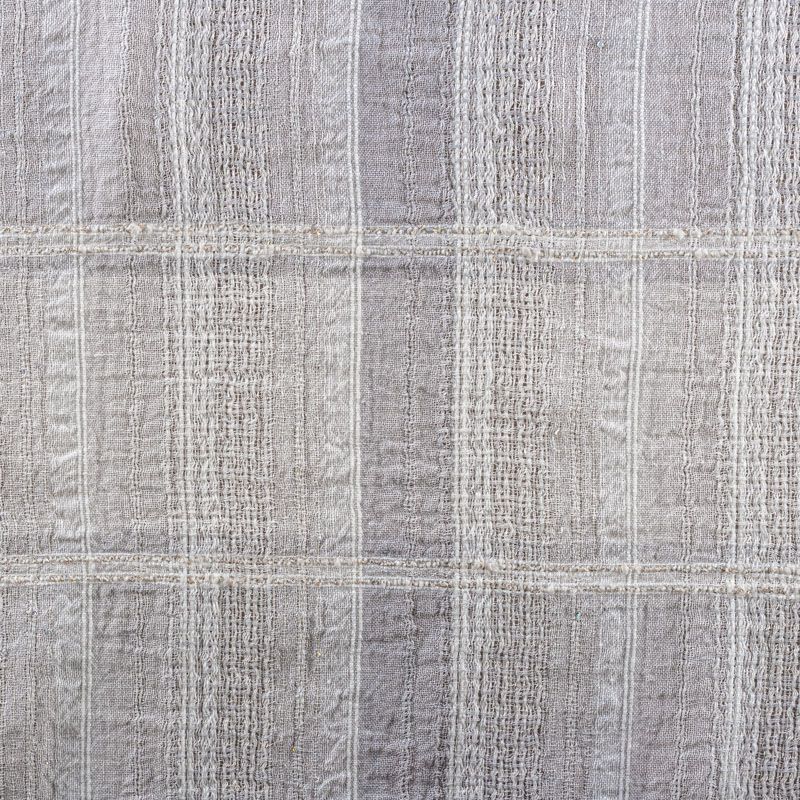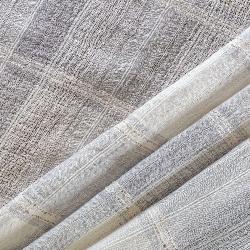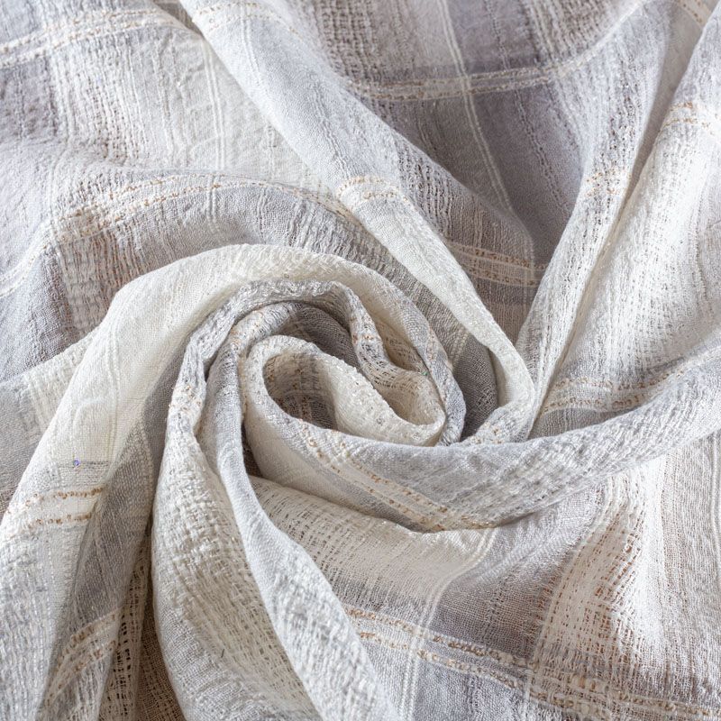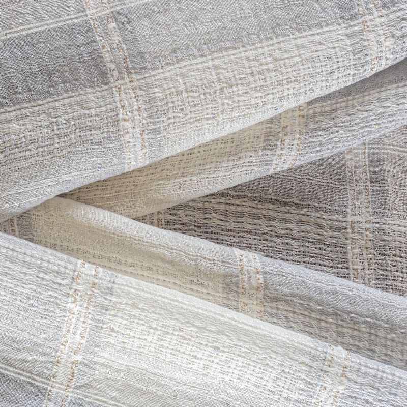 Итальянский лен с добавлением вискозы средней плотности со сложной "клетчатой" геометрией в светлых оттенках декорирован мелкими пайетками. Различная толщина нитей создает эффектную фактуру. Ткань пластичная, гибкая за счет плетения,  матовая, мягкая, приятная на ощупь, не рыхлая, комфортная в изделии. Отлично подойдет для пошива летних костюмов, рубашек, туник, платьев, сарафанов, юбок, жакетов, брюк или шорт, легкого пальто.