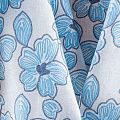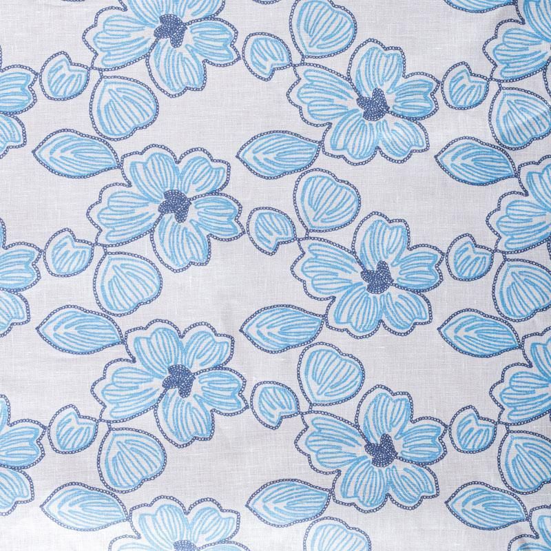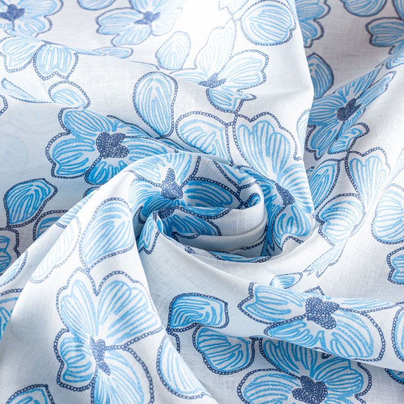 Итальянский лен средней плотности, декорированный крупными стилизованными цветами в синих и голубых оттенках. Ткань прочная, имеет матовую рельефную поверхность и полотняное переплетение, отлично держит форму, не много просвечивает, пластичная, комфортная в изделии. Отлично подойдет для пошива для летних костюмов, рубашек, туник, платьев, сарафанов, юбок, жакетов, брюк или шорт.
