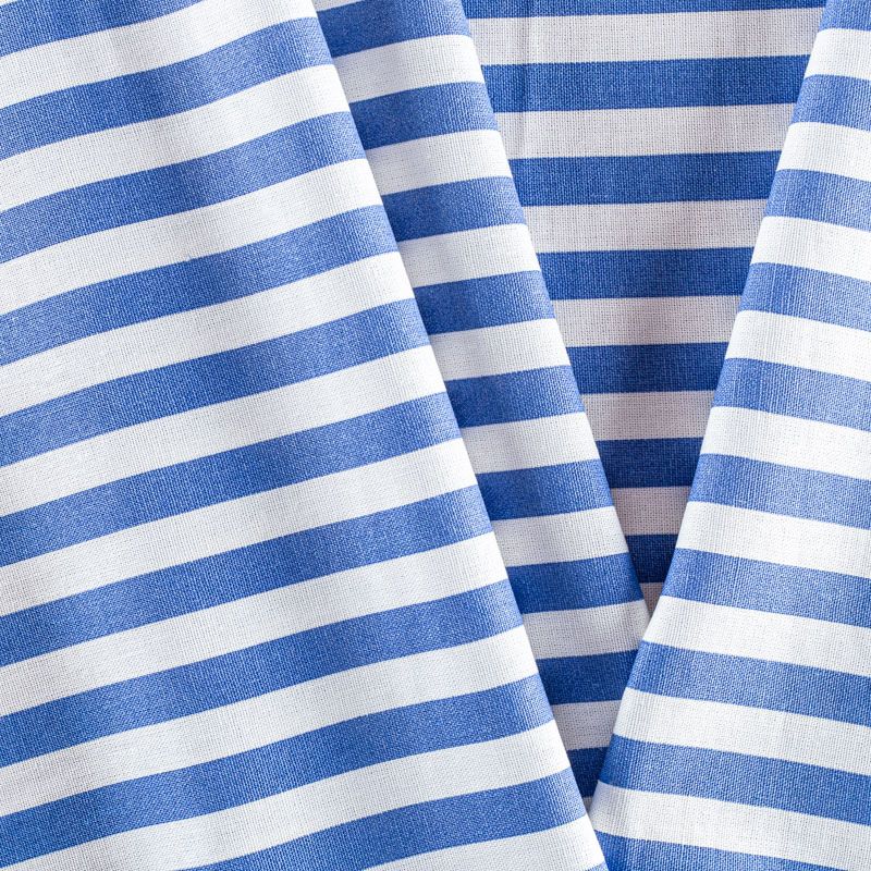 Льняная костюмно-плательная ткань в вертикальную полоску синего цвета средней ширины. Ткань прочная и плотная, с выразительной матовой рельефной поверхностью и полотняным переплетением, отлично держит форму, комфортная в изделии. Стильный вариант для летних пальто, кардиганов, платьев, сарафанов, юбок, жакетов, брюк или шорт.