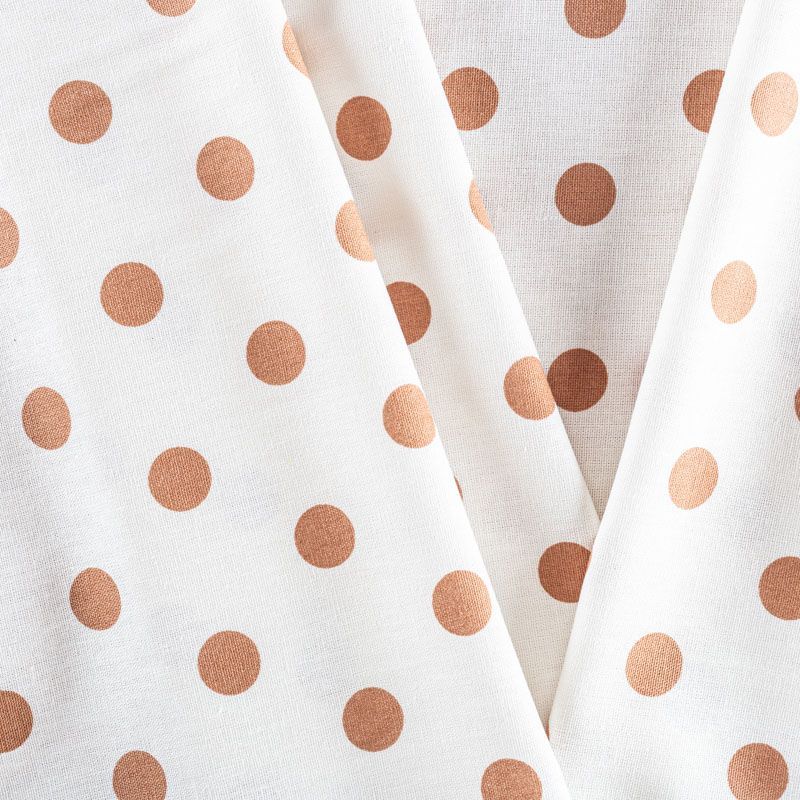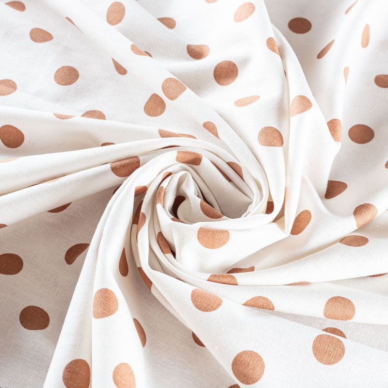 Льняная костюмно-плательная ткань молочного оттенка в рыже-коричневый горох. Ткань прочная и плотная, с выразительной матовой рельефной поверхностью и полотняным переплетением, отлично держит форму, комфортная в изделии. Стильный вариант для летних пальто, кардиганов, платьев, сарафанов, юбок, жакетов, брюк или шорт.