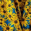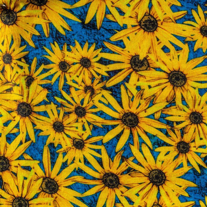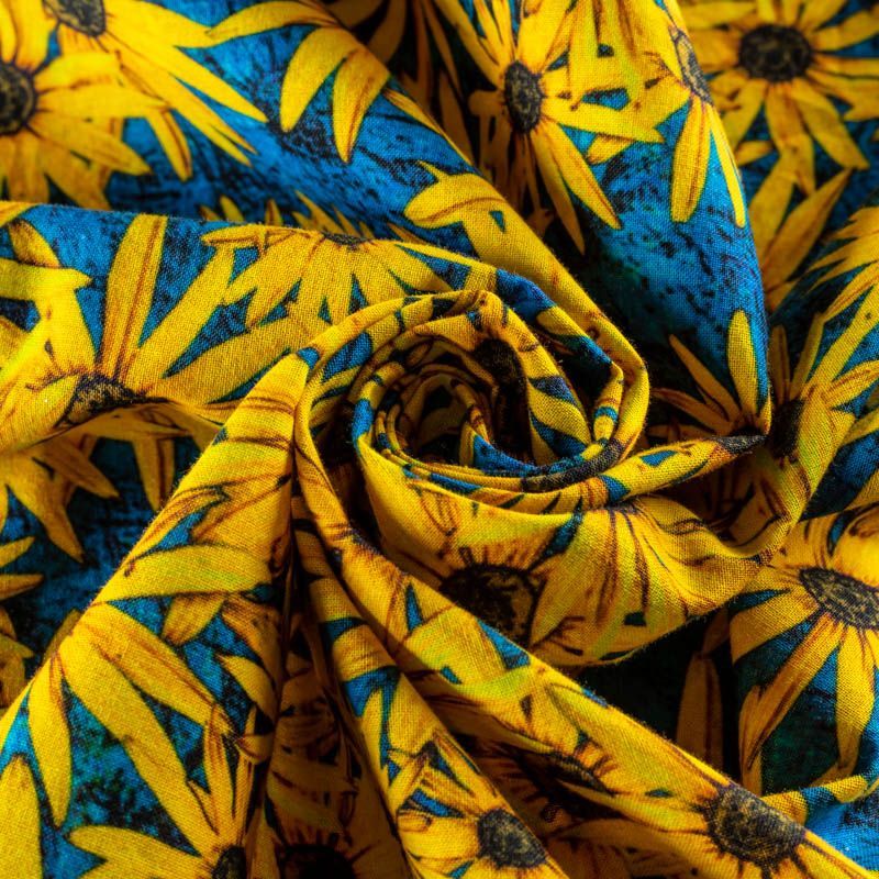 Плательно-рубашечный лен василькового оттенка с ярким солнечным цветочным принтом. Ткань легкая, средней плотности, поверхность матовая. Приятная на ощупь, хорошо держит форму, немного тянется. Отличный вариант для летних  платьев, сарафанов, рубашек, брюк или шорт.