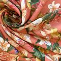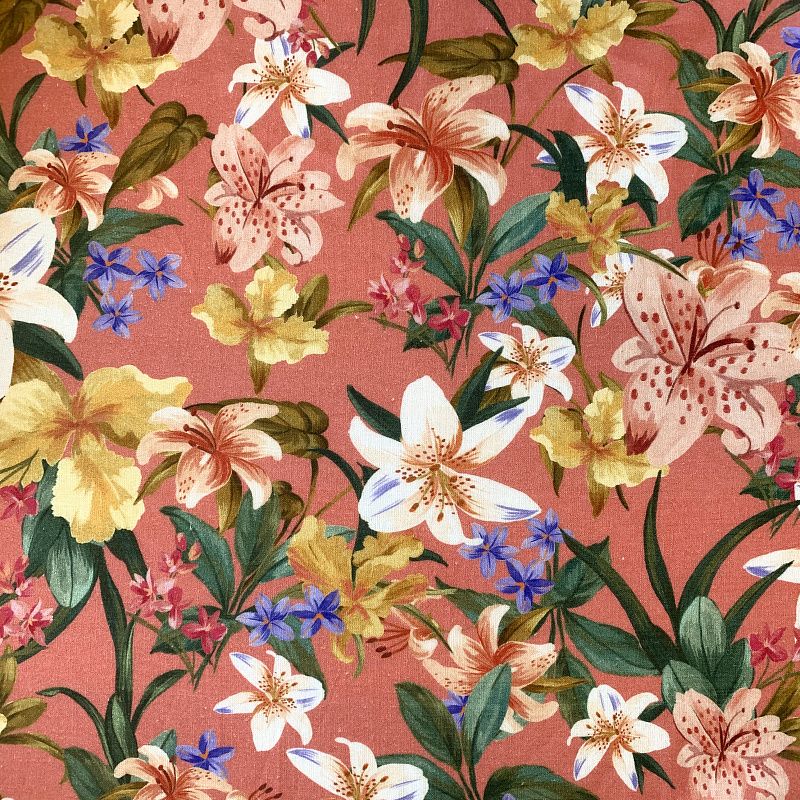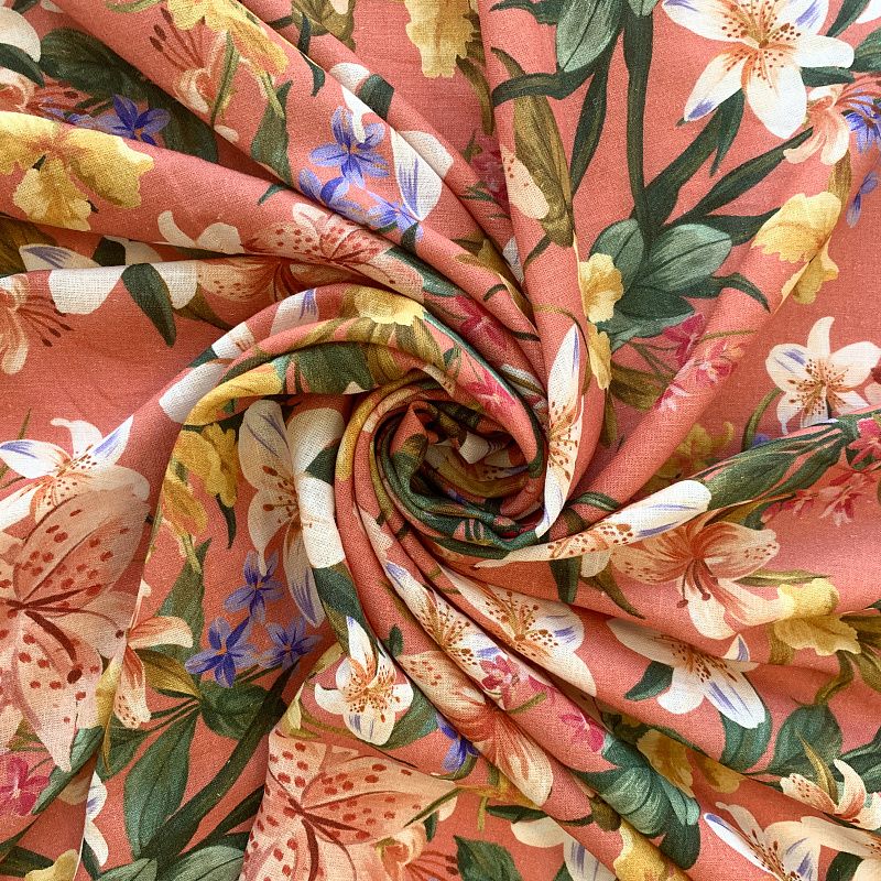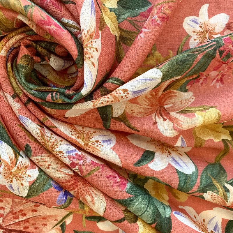 Прочный, выразительная матовая рельефная поверхность, полотняное переплетение, хорошо держит форму, мягкий на ощупь, пластичный, отлично драпируется, тянется. Прекрасно подойдет для пошива летних платьев, сарафанов, юбок, рубашек, брюк и шорт. Льняная плательная ткань с изображением соцветий ярких лилий на благородном коралловом фоне.