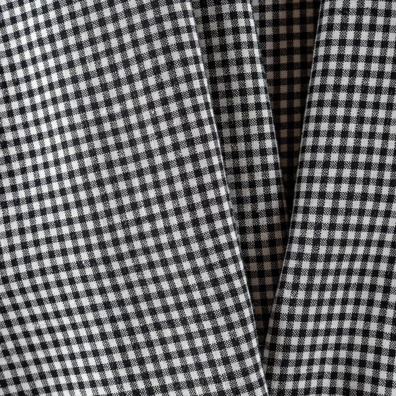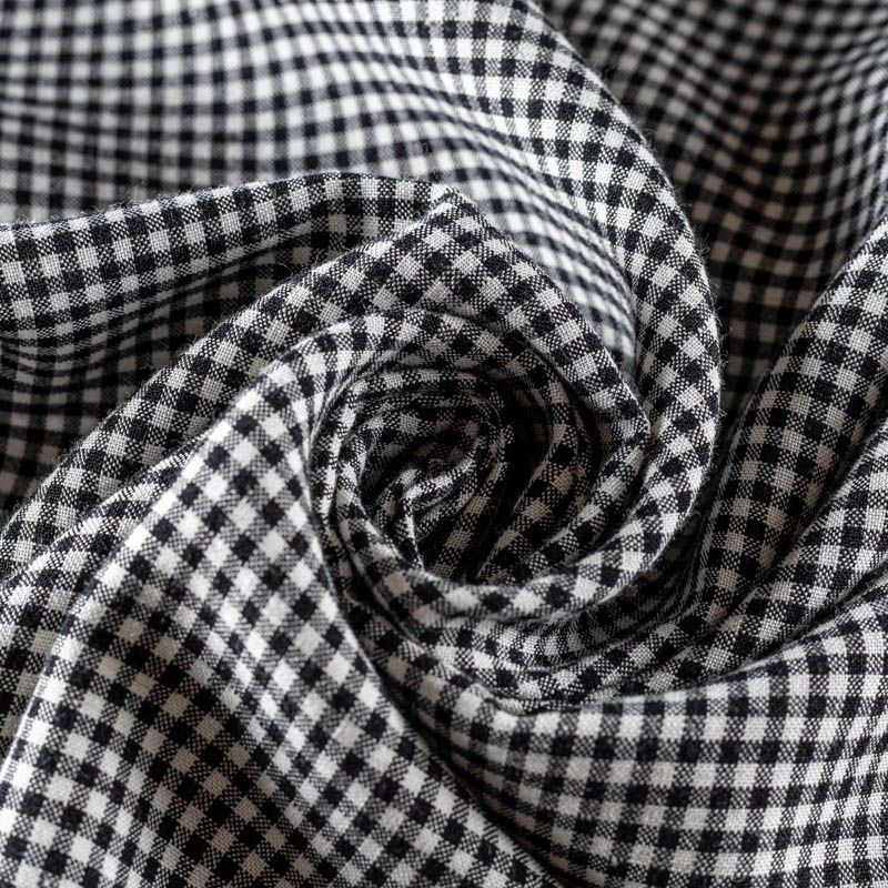 Прочный, выразительная матовая рельефная поверхность, полотняное переплетение, отлично держит форму, жестковатый на ощупь, но комфортный в изделии. Стильный вариант для платьев, сарафанов, юбок, топов, брюк или шорт. Льняная костюмно-плательная ткань с принтом в мелкую черную клеточку.
