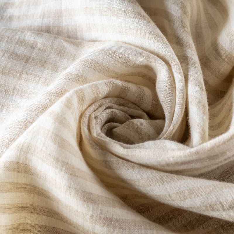 Прочный, выразительная матовая рельефная поверхность, полотняное переплетение, хорошо держит форму, мягкий на ощупь, пластичный, отлично драпируется. Прекрасно подойдет для пошива летних платьев, сарафанов, юбок, рубашек, брюк и шорт. Льняная плательная ткань с серой полоской. Ширина полоски - 1 см.