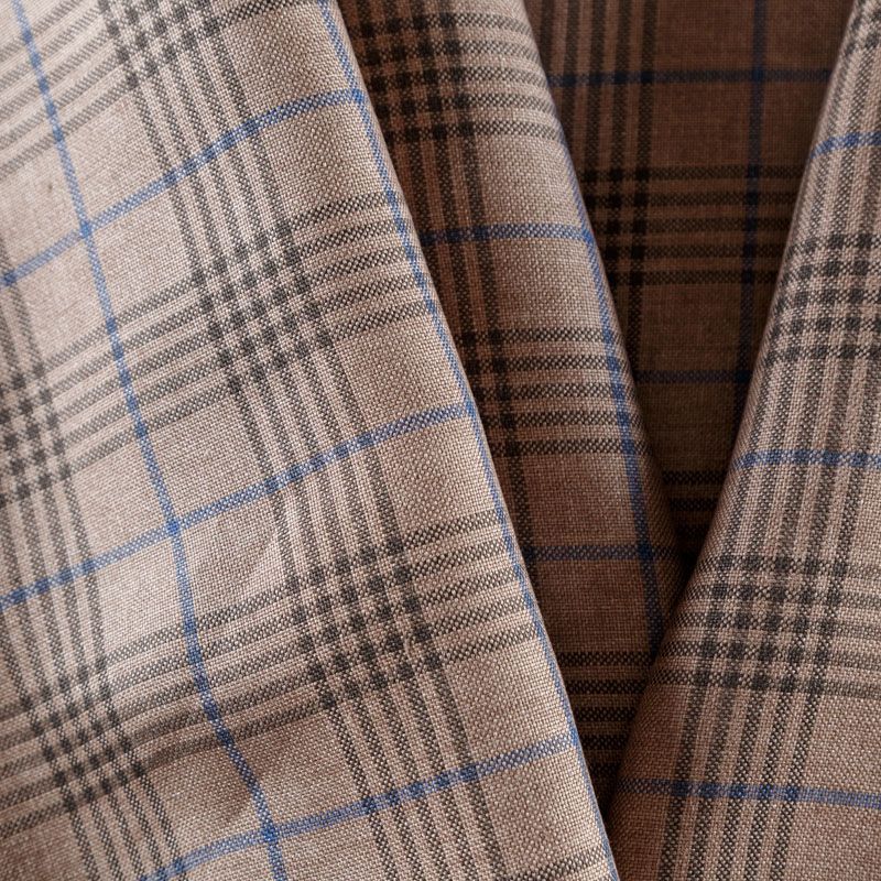 Итальянский костюмно-плательный лен с добавлением вискозы в бежевого оттенка в элегантную клетку. Ткань прочная, имееет на ощупь приятную поверхность, визуально - выраженный рельеф и полотняное переплетение, держит форму, пластичная. Подойдет для пошива летних костюмов, жилета, брюк, шорт, в том числе мужских, юбок, платьев, сарафанов, топов, комбинезонов, жакетов, кардиганов.