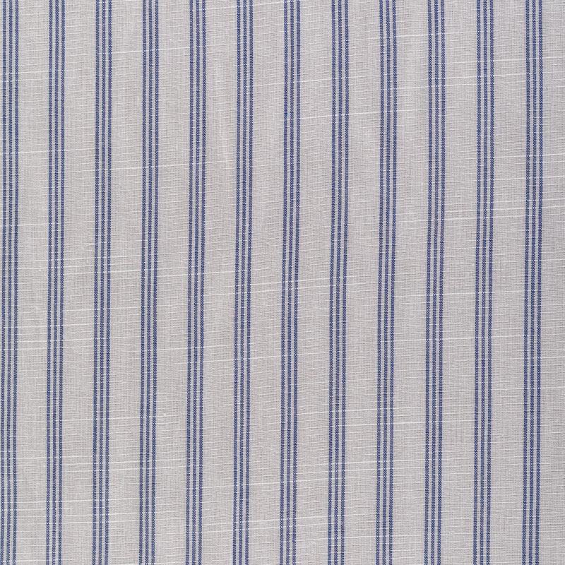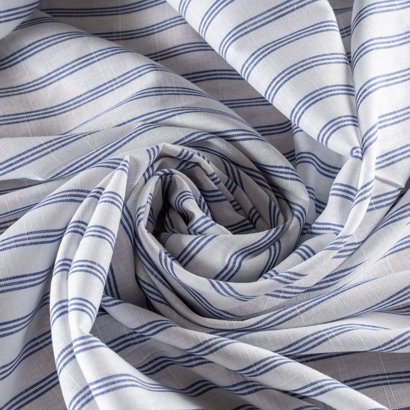 Ткань лёгкая, непрозрачная, поверхность матовая имеет льняную текстуру, приятная к телу, хорошо драпируется. По назначению -  для юбки, платья-рубашки, сарафана, туники. На белом фоне тройная тонкая полоска темно-синего цвета расположена вдоль кромки.