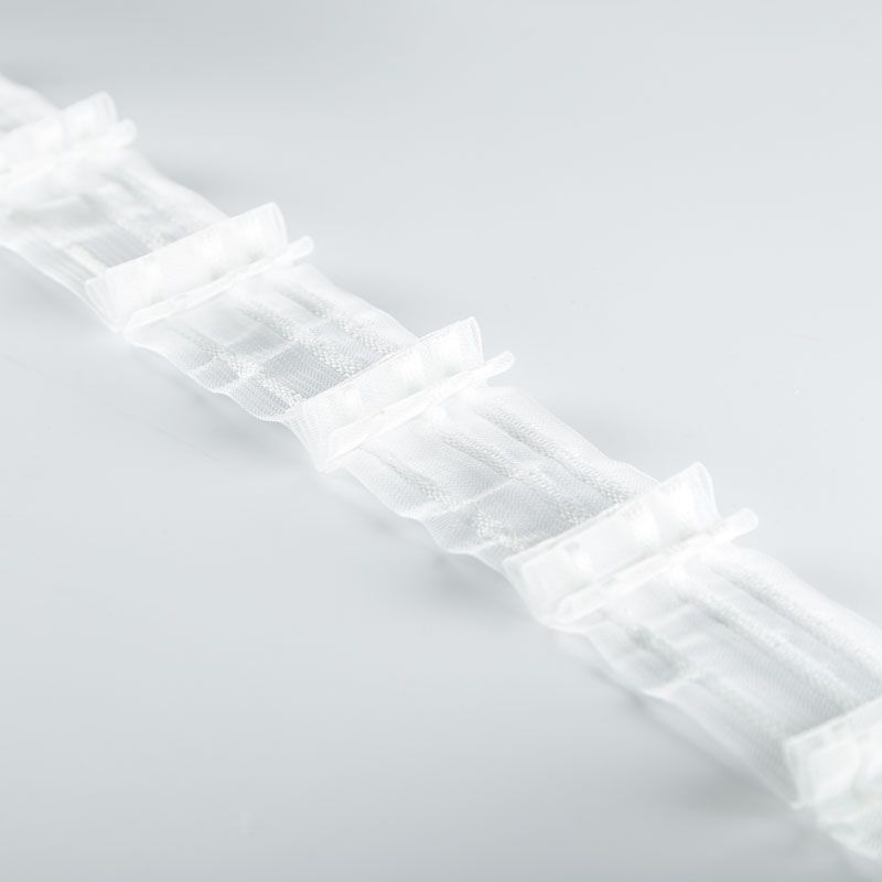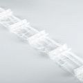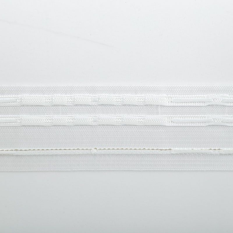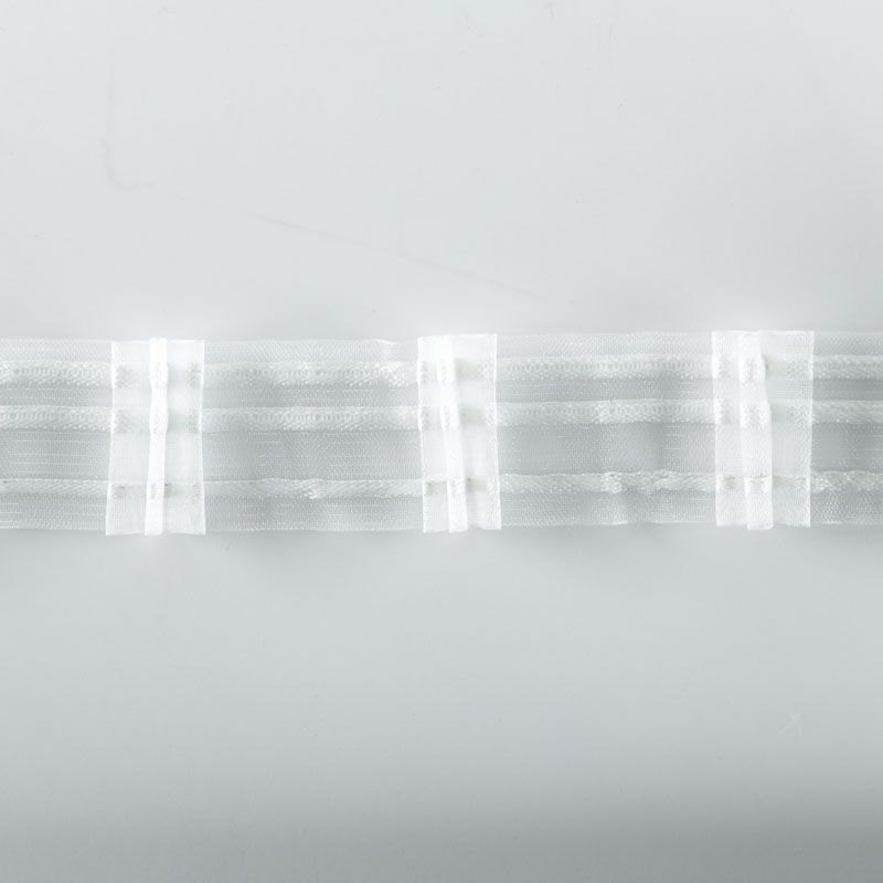 Шторная лента прозрачная с белыми нитями для тюлей и портьерных тканей с тройной бантовой складкой. Сокращение - 1:2,2, раппорт - 17,5 см, расстояние между складками - 8 см, 2 ряда кармашков, крепление - крючки.