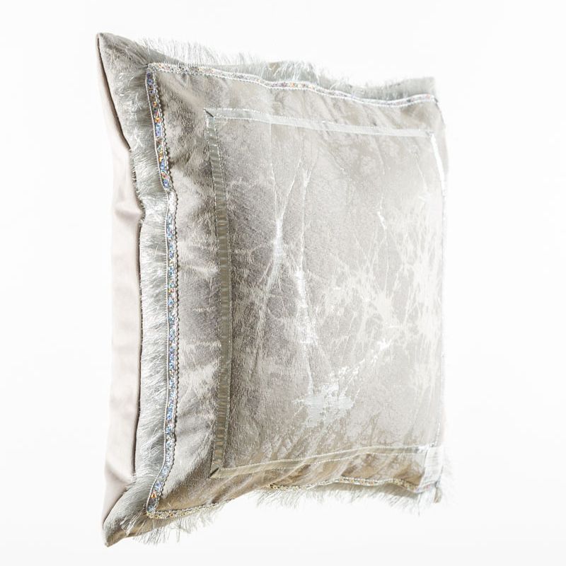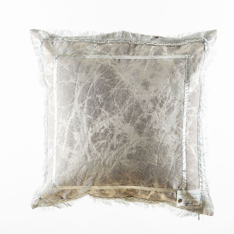 Оригинальная дизайнерская наволочка на подушку 45х45 см. Лицевая сторона выполнена из жаккардовой ткани в серебристых оттенках и декорирована кантом и бахромой с пайетками. Обратная сторона - мягкий бархат серого оттенка. Потайная молния расположена в нижнем шве. Декоративные подушки сделают акцет на цветовой гамме Вашего помещения, подчеркнут особенности интерьерного стиля или тематику оформления. Внимание! Подушка-вкладыш приобретается отдельно.