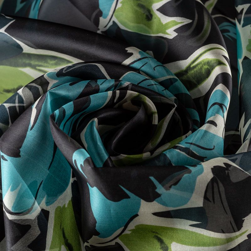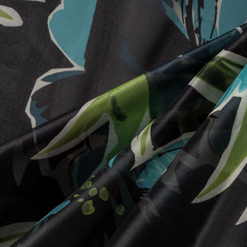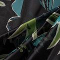 Шелковая органза с крупным флористическим принтом на черном фоне. Хорошо держит форму, легкая, тонкая, просвечивает. Подойдет на блузку, платье, тунику или юбку.