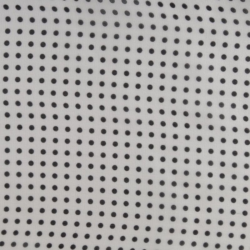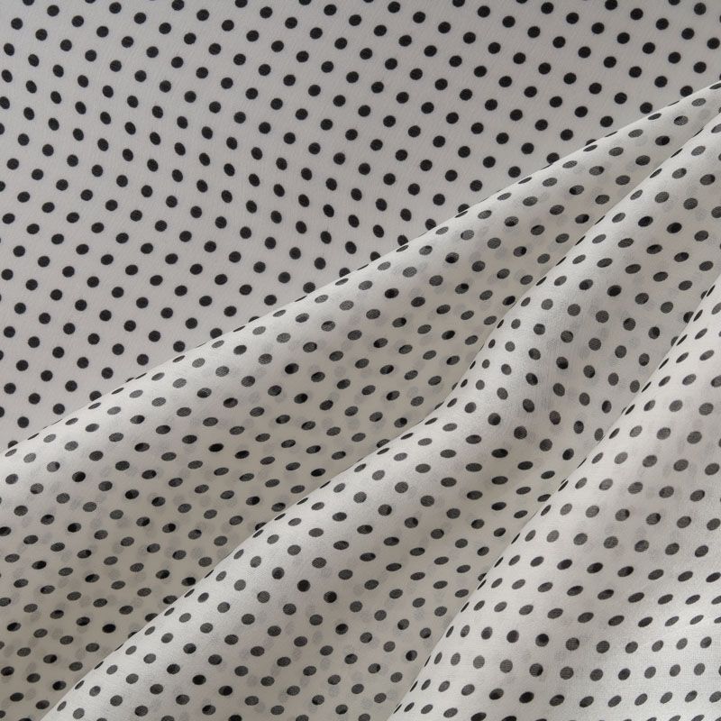 Итальянская шелковая полупрозрачная органза сумрачно-белого цвета с мелким принтом в горошек. Ткань очень легкая, воздушная, отлично держит характерную для органзы форму, но при этом она не жесткая, пластично драпируется объемными фалдами. Идеальна для пошива платья свободного силуэта с нижним чехлом, блузы с объемными рукавами, летней туники, рубашки.