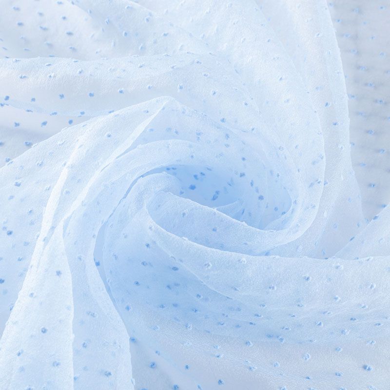 Легчайший, изящный, воздушнный и прозрачный материал с благородной переливчатой поверхностью. Прекрасно держит форму в заложеных складках. На лицевой стороне объемные декоративные элементы из флока диаметром 0.5 см. Подойдет для создания в изделии декоративных деталей, новогодних костюмов, нарядных платьев, блузок.