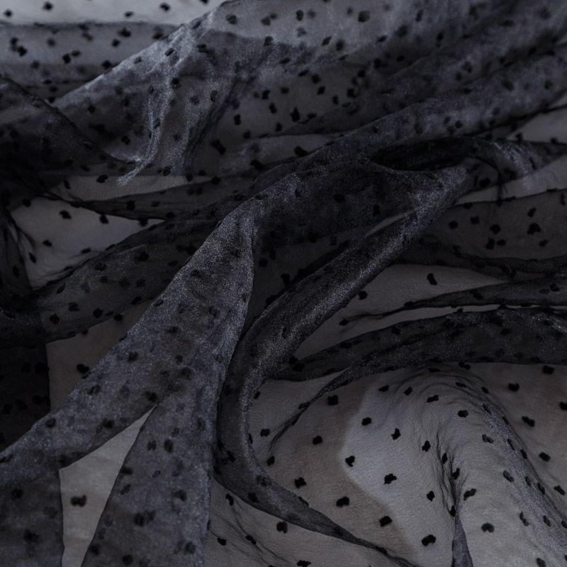 Легчайший, изящный, воздушнный и прозрачный материал с благородной переливчатой поверхностью. Прекрасно держит форму в заложеных складках. На лицевой стороне объемные декоративные элементы из флока диаметром 0.5 см. Подойдет для создания в изделии декоративных деталей, новогодних костюмов, нарядных платьев, блузок.