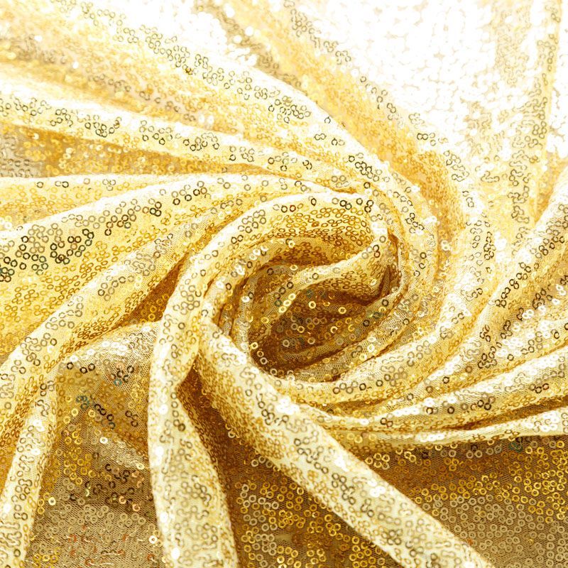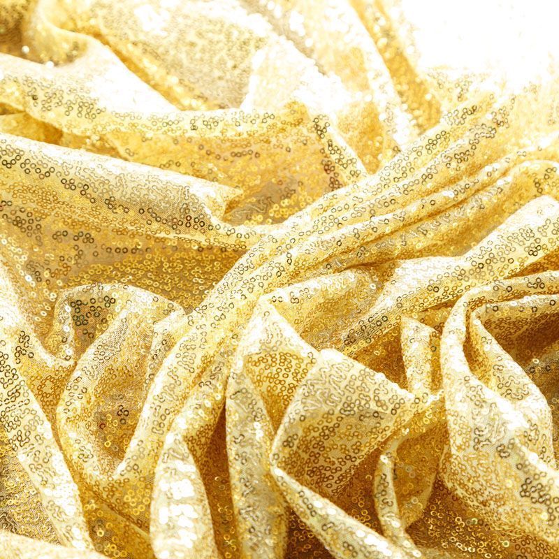 Блестящие пайетки в золотистом оттенке. Мелкие, размером около 3 мм, расположены в хаотичном порядке. Основа - мягкая и эластичная сетка.  Ткань полупрозрачная, может потребоваться подклад. Подойдет для вечернего, коктейльного платья, юбки, нарядных детских изделий, танцевальных и сценических костюмов.