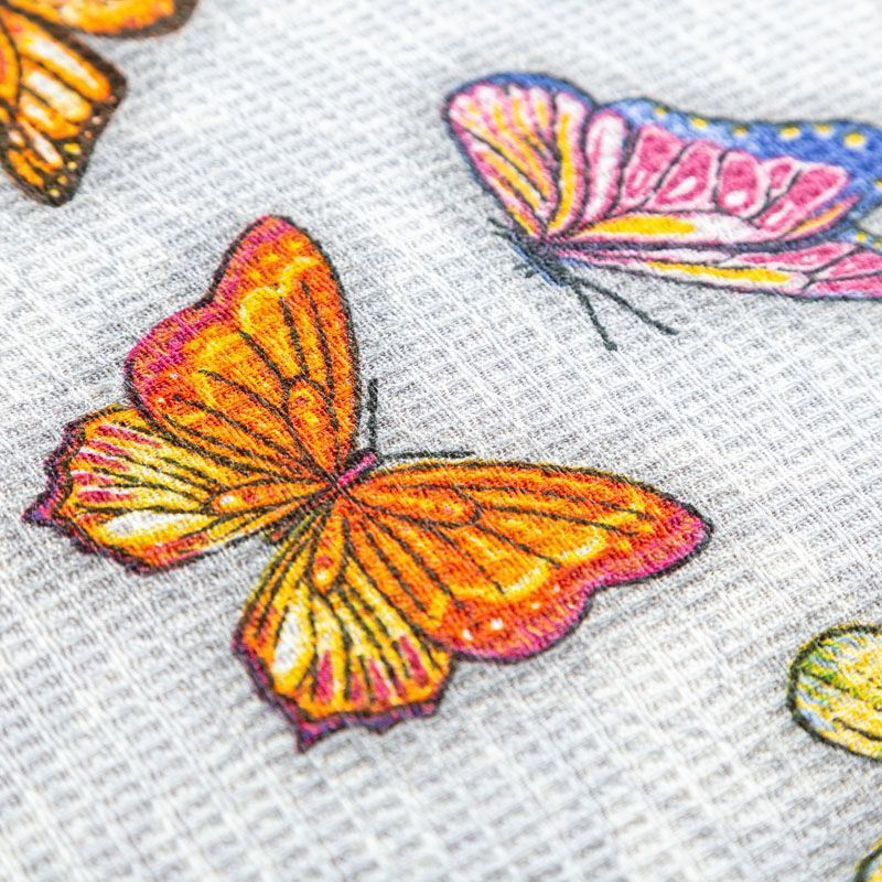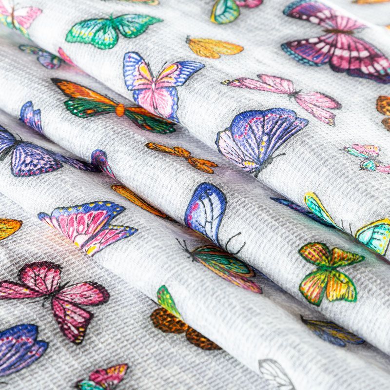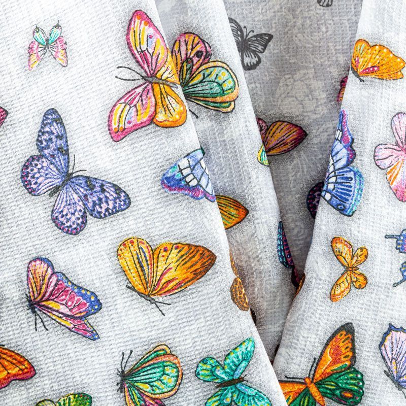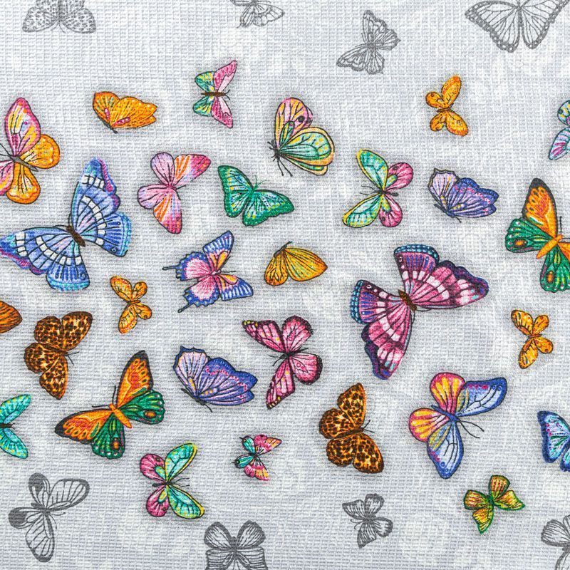 Качественная натуральная хлопчатобумажная ткань, обладающая высокой гигроскопичностью, с яркими бабочками на светло-сером фоне. Универсальный материал, из которого  шьют кухонные полотенца, скатерти, прихватки, салфетки.