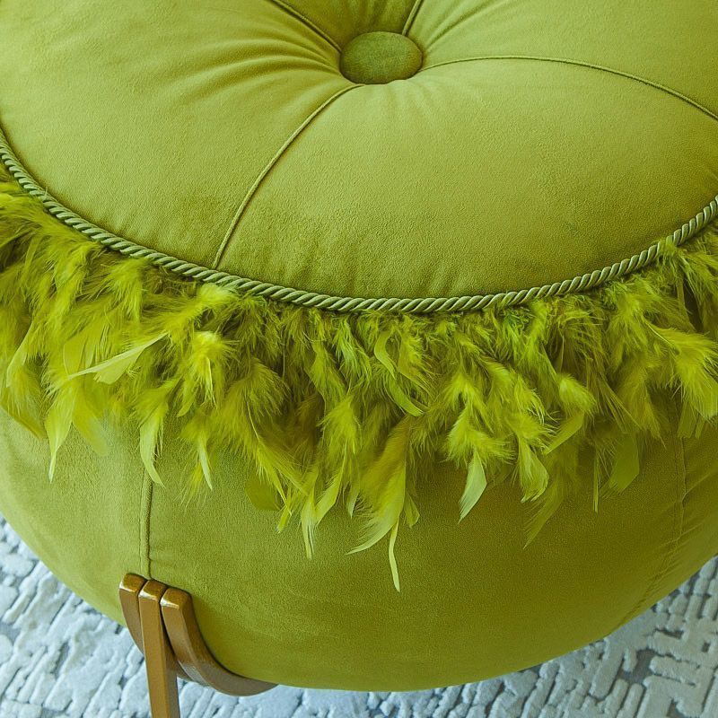 Ориганальный дизайнерский пуф выполнен из бархата грушевого оттенка, декорирован кантом и перьями. Ножки выполнены из окрашенного металлического профиля. Диаметр сидения - 50 см, диаметр в основании - 65 см, высота от пола - 51 см.