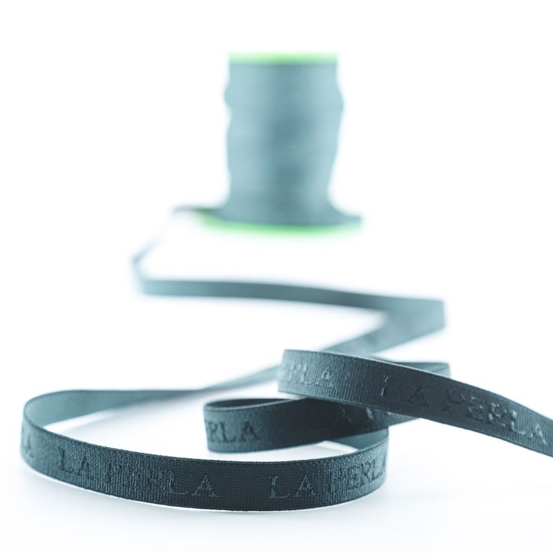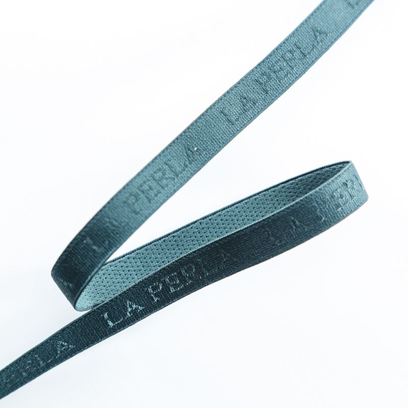 Бретелечная резинка используется для обработки стана бюстгальтера, а также для бретелей. Матовая с жаккардовой надписью бренда. Края ровные.