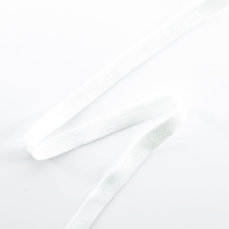 Бретелечная резинка используется для обработки стана бюстгальтера, а также для бретелей. Матовая с жаккардовой надписью бренда. Края ровные.
