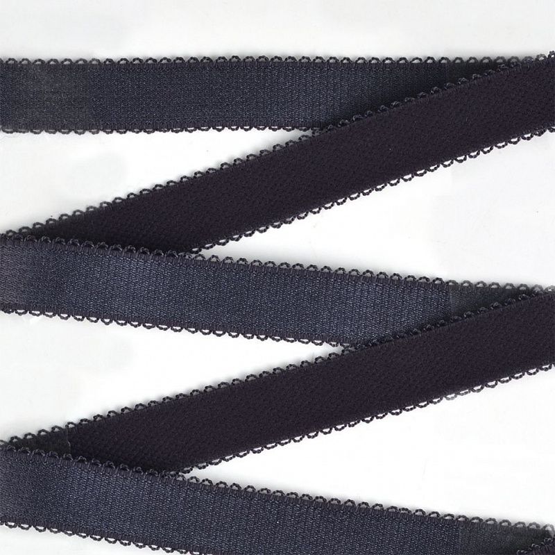 Классическая бретелечная резинка используется для обработки стана бюстгальтера, а также для бретелей. Края фигурные, блестящая. Плотность 12 ± 0.3 г/м. Растяжимость 55 ± 10 %.
